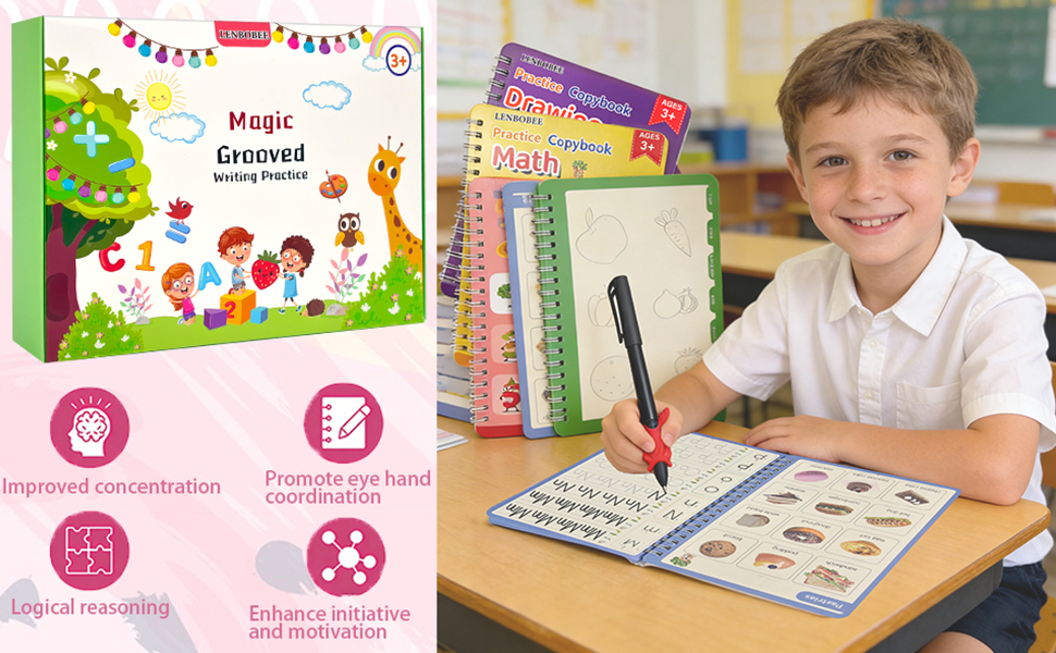 Reusable & Engaging: Eco-friendly reusable grooved handwriting workbook reduces paper waste. Colorful friendly pages make tiny thinkers magic grooved writing practice fun, turning tedious drills into enjoyable activities—perfect Christmas, New Year, birthdays, or back-to-school gift for young learners.