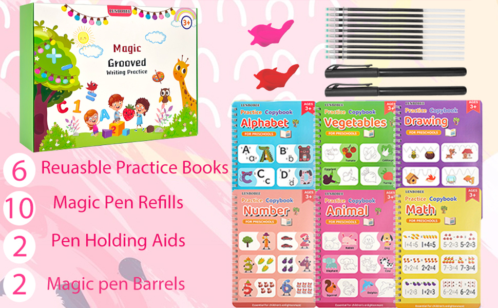 All-In-One Value Package: Complete magic grooved writing practice kit includes 6 grooved handwriting practice books, 2 magic pens, 10 ink refills, 2 soft ergonomic grips & a convenient storage box. Unbox & start learning instantly.