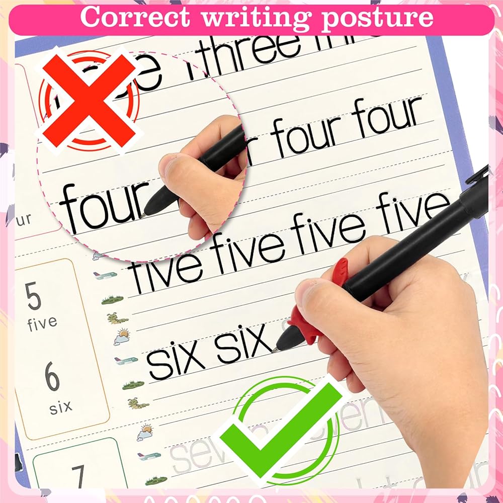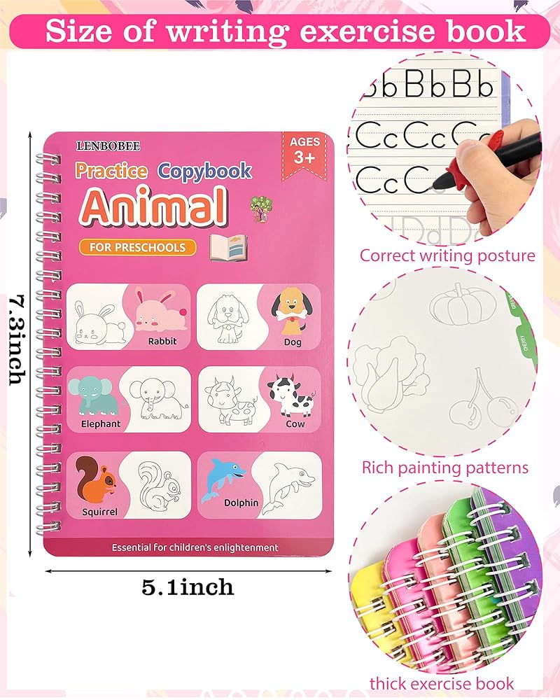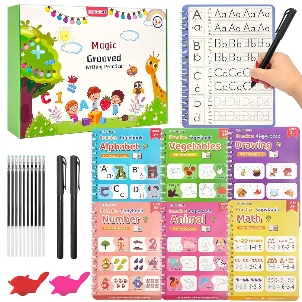 Safe & Durable Materials: Reusable grooved handwriting workbook adopts thick tear-resistant pages with clear 3D grooves. Non-toxic odorless magic pens, latex-free silicone ergonomic grips—100% safe for tiny hands daily use.
