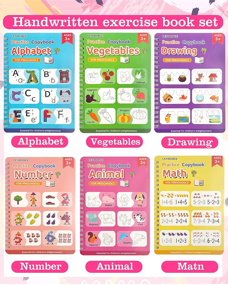 Smart Grooved Design: 3D grooves guide to trace letters/numbers/shapes accurately, building muscle memory for neat handwriting. Magic ink fades in 30 mins, enabling endless reuse of your little explorer writing books. Ergonomic grips correct grip posture for lefties & righties.