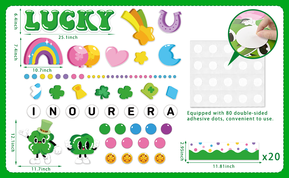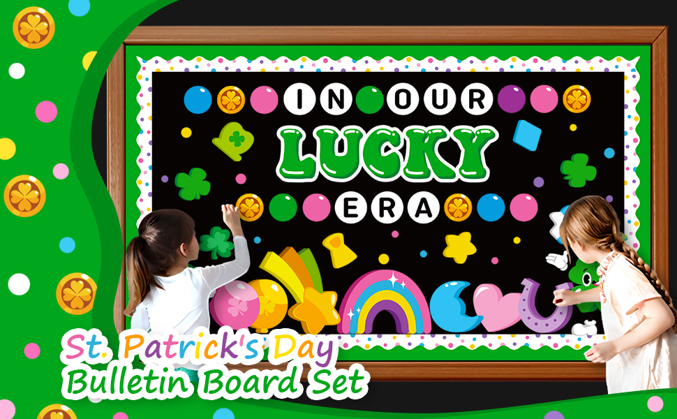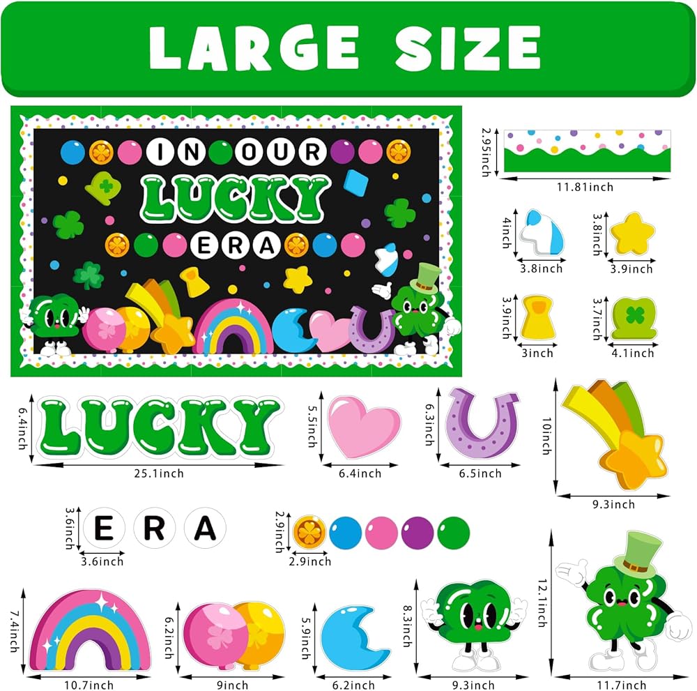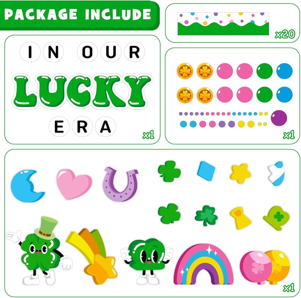 Complete "Lucky Charms" Set - Stop buying pieces separately! This all-in-one St. Patrick's Day bulletin board sets include a large 'IN OUR LUCKY ERA' letters cutout, 16 Irish elements cutouts (such as shamrocks and rainbows), 4 gold coin cutouts, 36 circular cutouts (3 sizes), 20 St. Patrick's Day themed bulletin board borders, and also comes with 80 glue points. You can transform any blank wall into a festive masterpiece in just minutes without extra tools