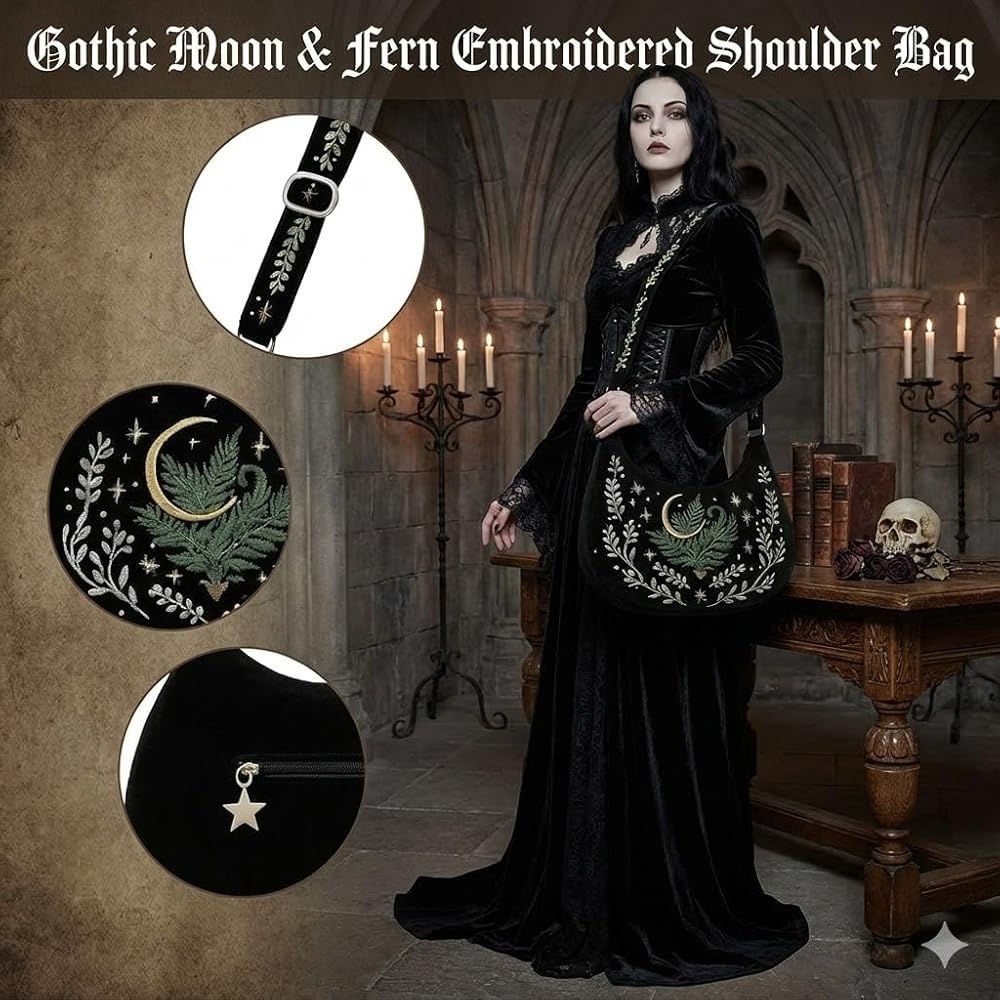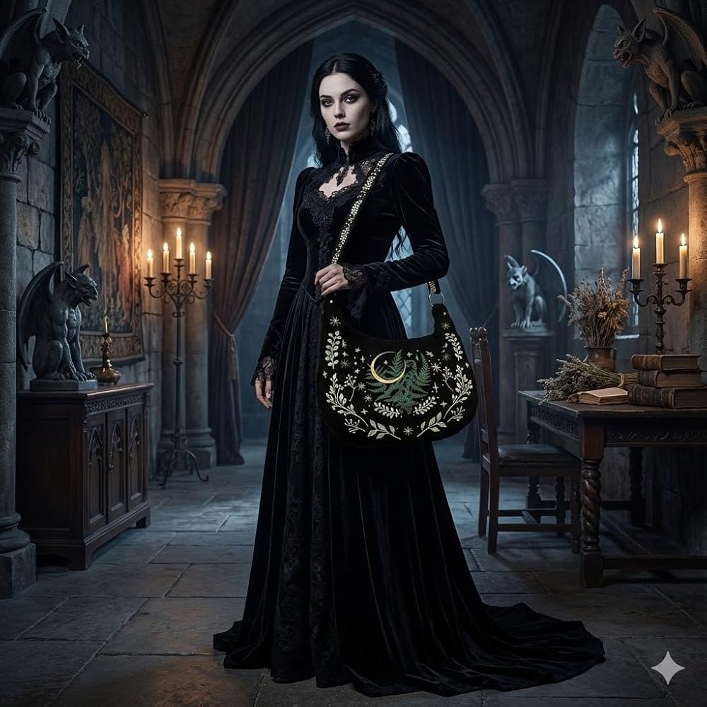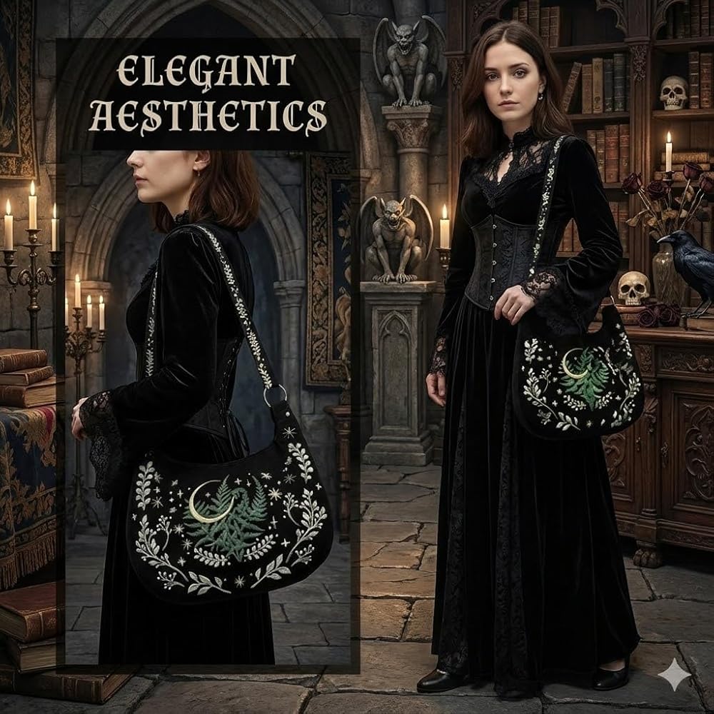 European Witchcore Aesthetic— Shadowy Gothic silhouette featuring mystical botanical embroidery for enchanting dark academia vibes
