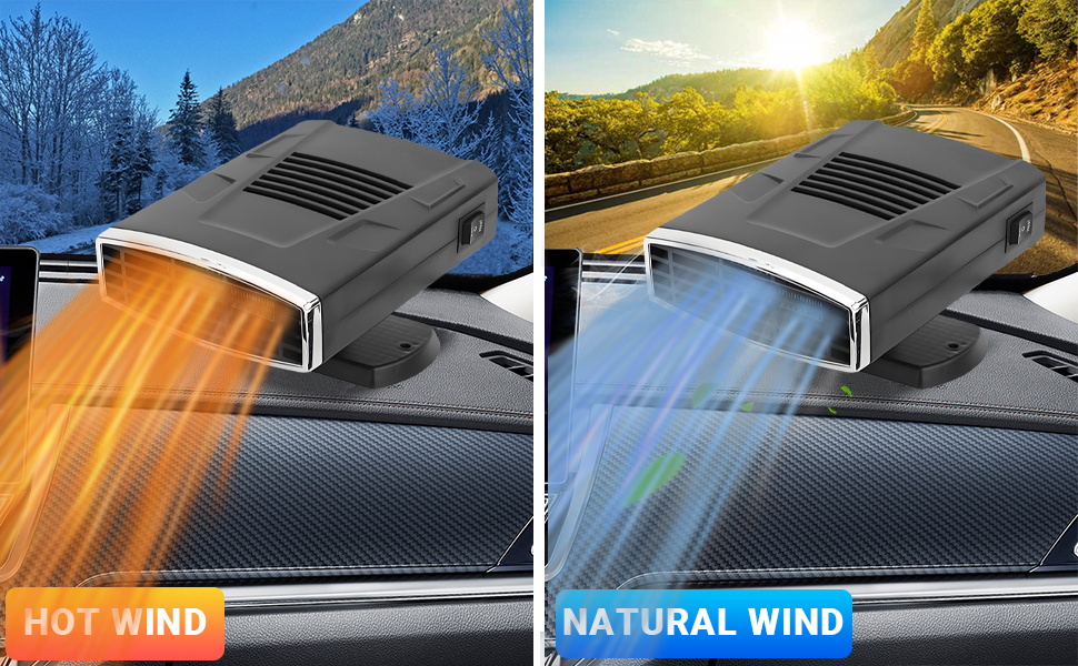 【Cold and Warm Dual Use】Our 12v portable car heater is available all year round.This car heater portable is not only ideal for demisting/defrosting windscreens.but it can also be used as a cooling fan in summer.The unique 360° rotatable bracket allows you to adjust the air outlet to any angle, ensuring optimal heating or cor defrosting the car window