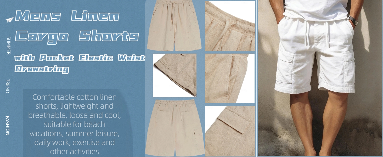 Design: Comfortable and cool cotton linen cargo shorts, based on the classic style of work pants. Pockets are designed on both sides of the legs, which not only serve as decoration but also provide storage. Moreover, they feature an elastic waistline with drawstrings, ensuring a tight fit when worn.