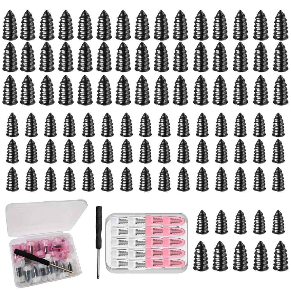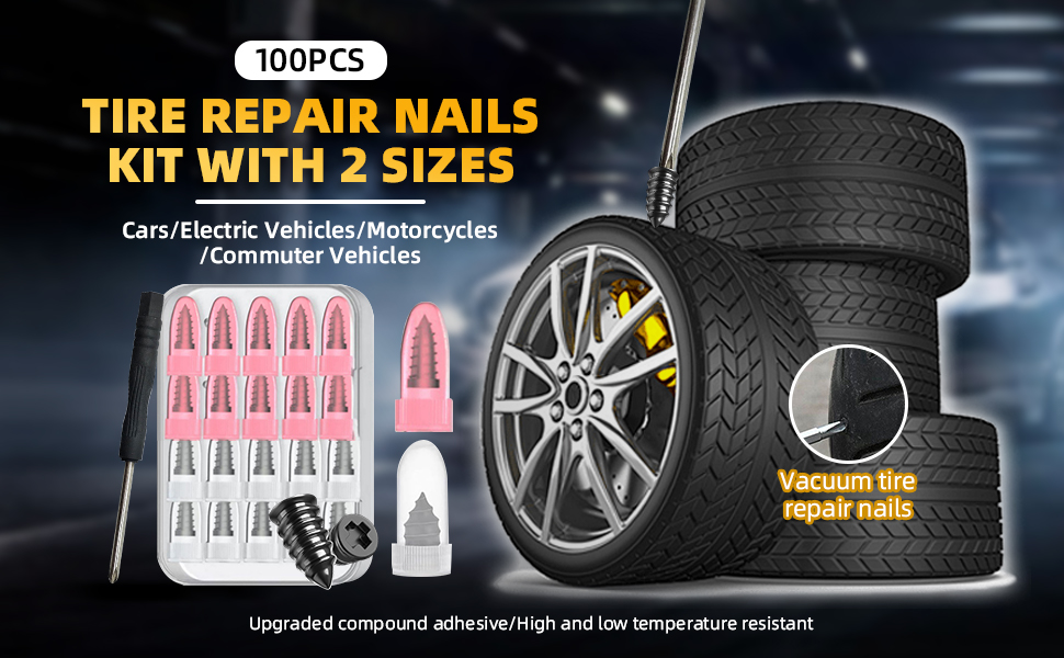 【Two sizes available】This kit includes 100 high-quality tire repair nails in two practical sizes: 50 smaller (0.21" x 0.46") and 50 larger (0.27" x 0.5"). Also contains 1 pc of screwdriver. Tips: Both sizes come in the same box, please pay attention to the size difference and find the right size for tire repair.