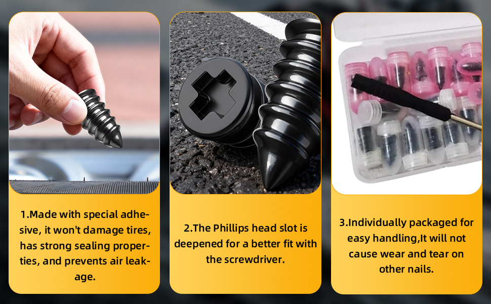 【Compact&Portable】The tire repair rubber nails kit package comes in a big clear plastic box. Each nail is individually stored in a plastic capsule. The plastic box packaging ensures that 100 tire repair rubber nails and a screwdriver can be put in it. It is small and portable and saves space.