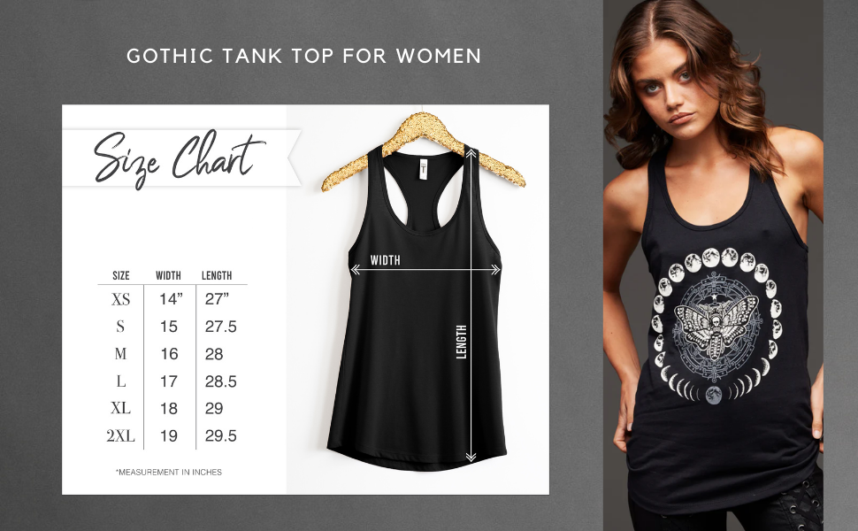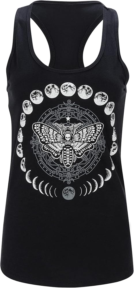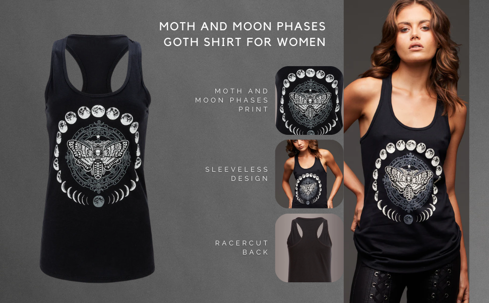 ملابس قوطية للنساء: امنح خزانة ملابسك لمسة غامضة مع هذا القميص الأسود بدون أكمام ذو رسومات مراحل العثة والقمر للنساء.