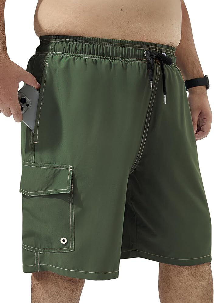 Multi-Function Utility Pocket:This plus size swim trunk features two side pockets with soft mesh lining, and a multi-function utility cargo-style pocket comes with a quick-access Velcro flap, an internal elastic key leash to prevent loss, and a built-in drainage grommet to shed water and sand instantly—Ideal for stylish, everyday, and outdoor use with ample storage and efficient drainage.