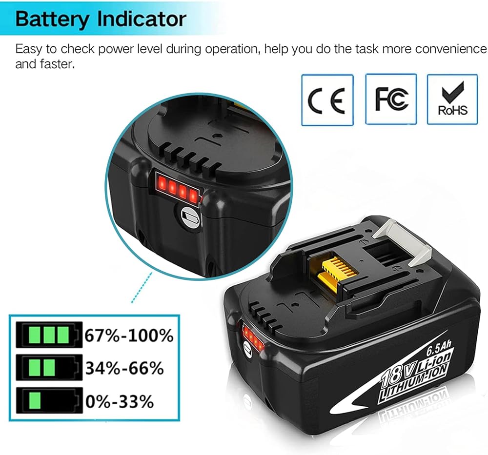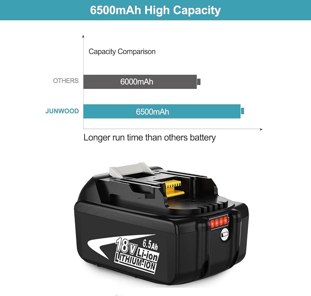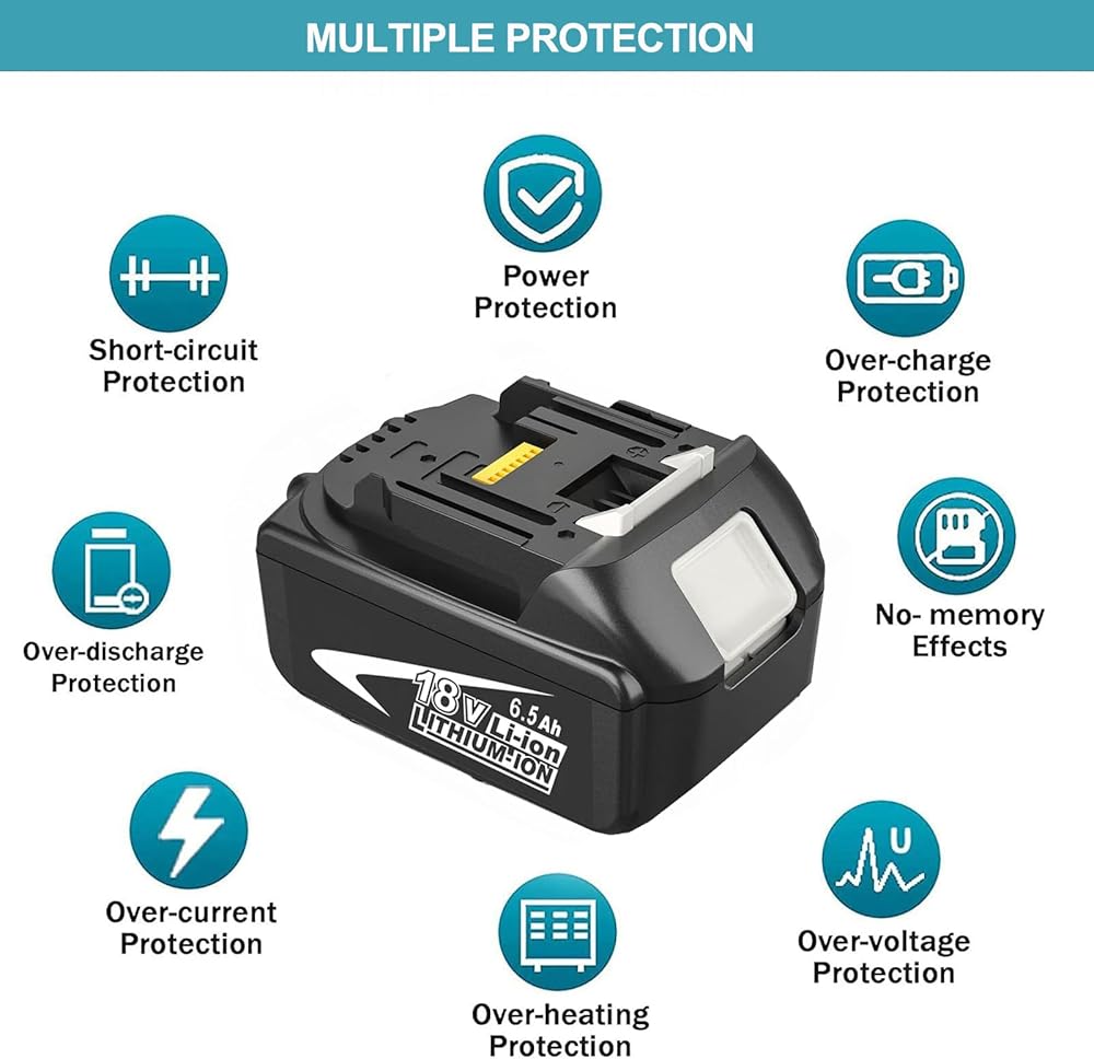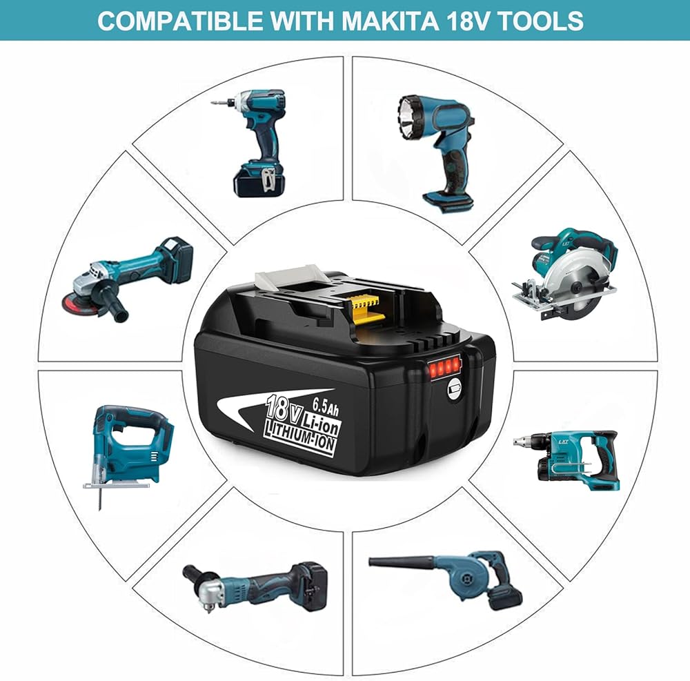 🔋【BATTERY FEATURES 】Battery Voltage: 18V | Battery Capacity: 6500mAh | Wattage: 117Wh | Battery Type: Rechargeable Lithium-ion | Made with high quality Li-ion cells. Compatible with Makit 18v cordless tools.