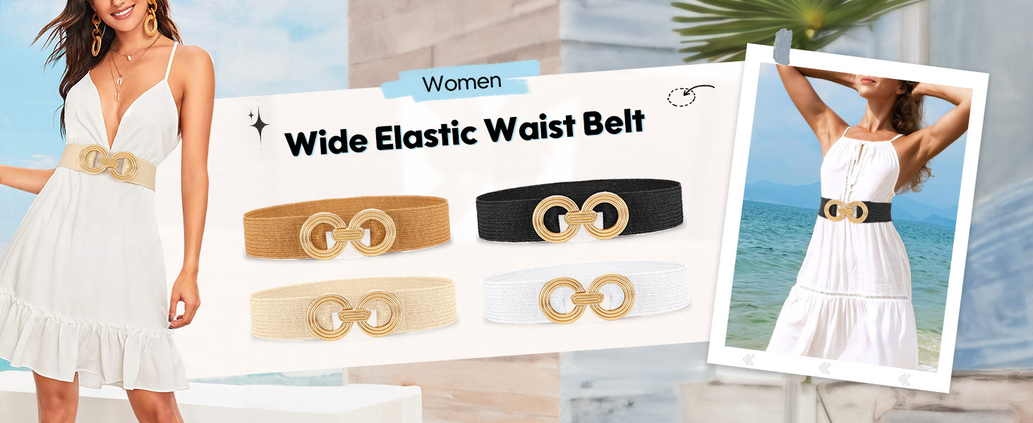 Women Straw Woven Elastic Belts Wide Stretch Waist Belt for Summer Dress