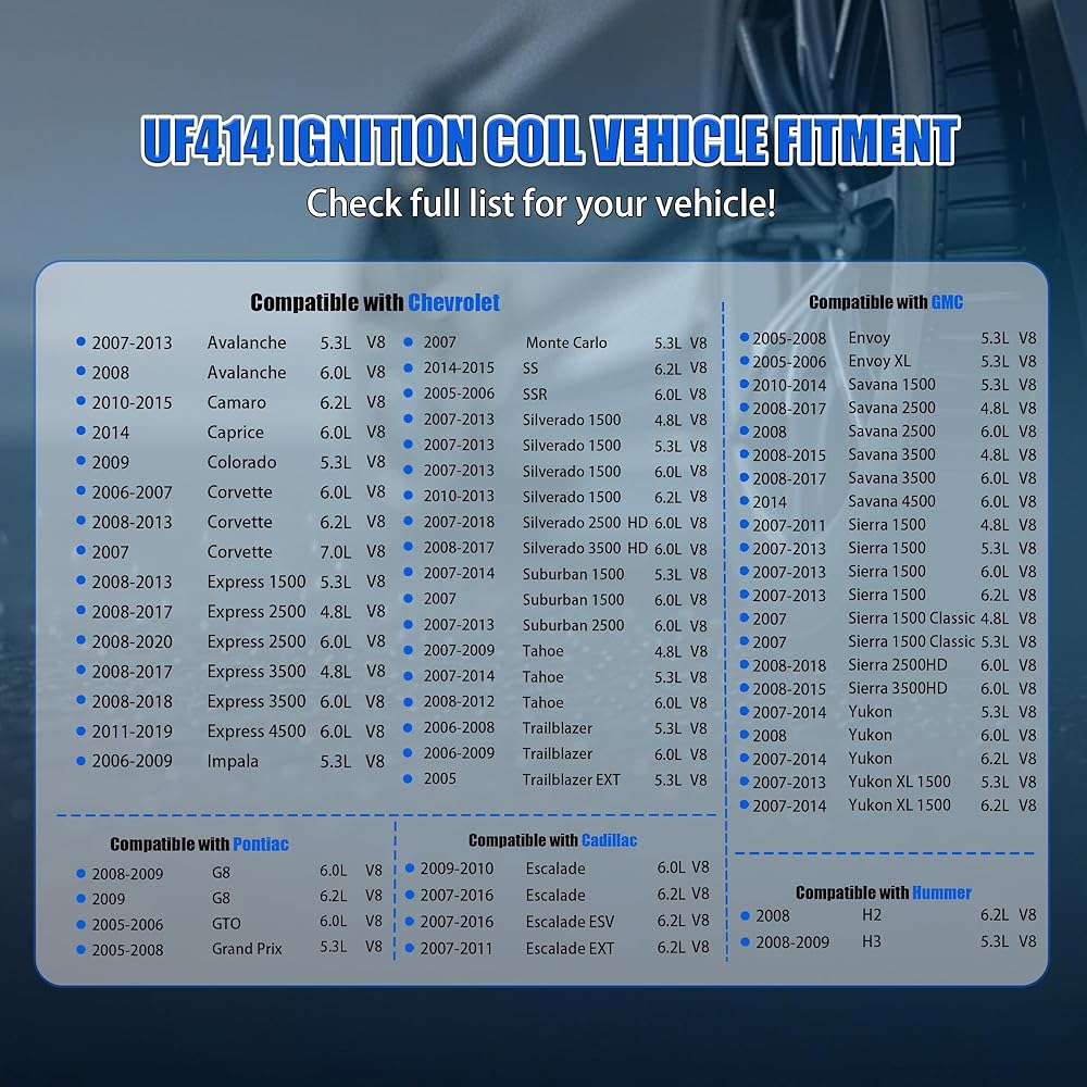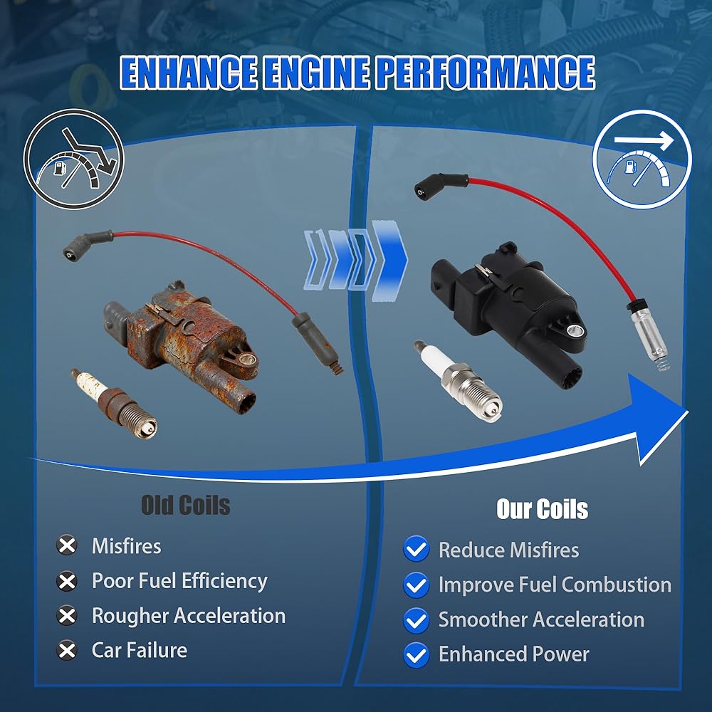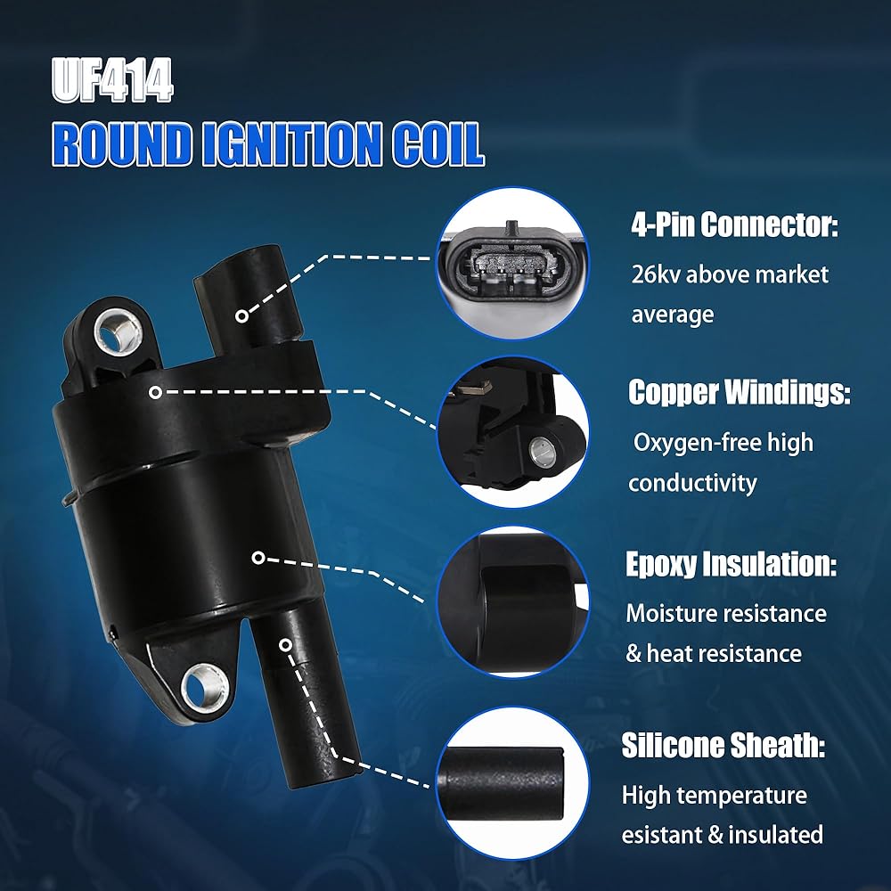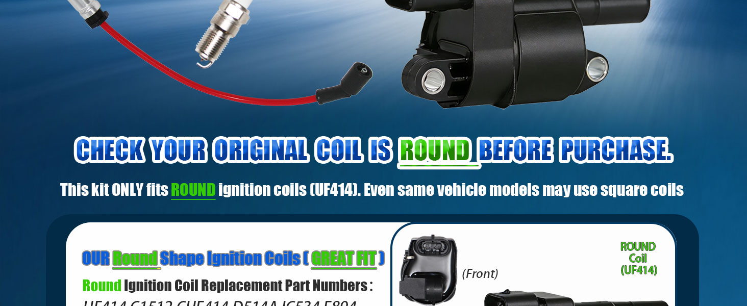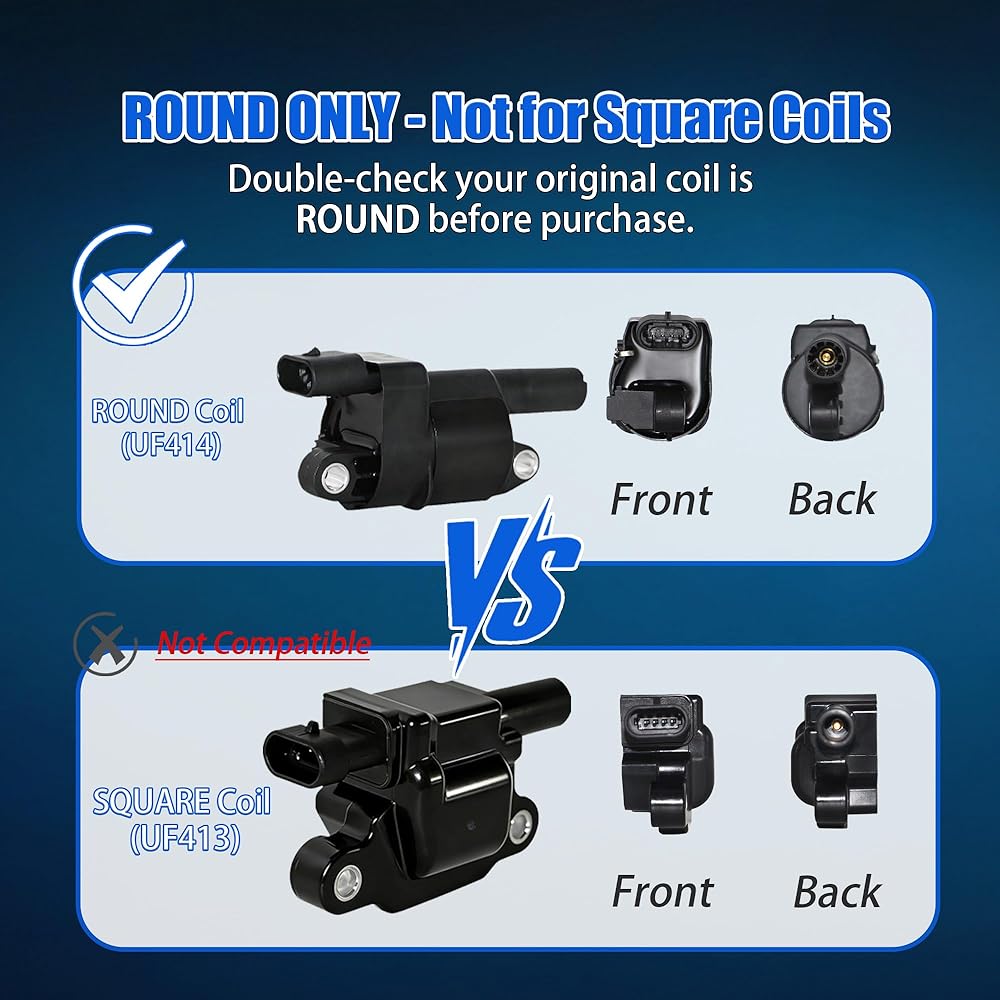 ✨【Only for Round Coils】This is a ROUND ignition coil packs (UF414). The same vehicle model may use different coil shapes. Please check description or fitment bar, double check that your original coil is ROUND (not SQUARE) before purchasing.