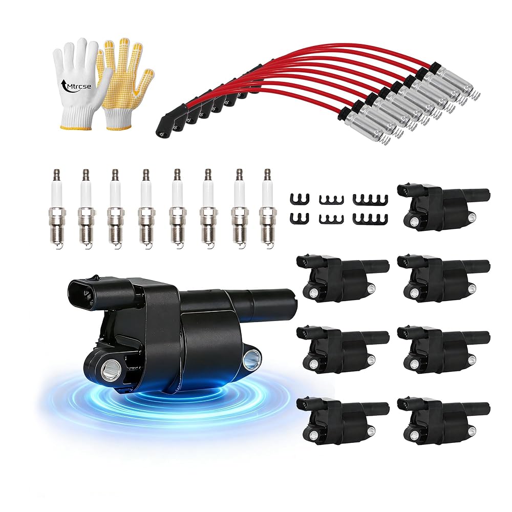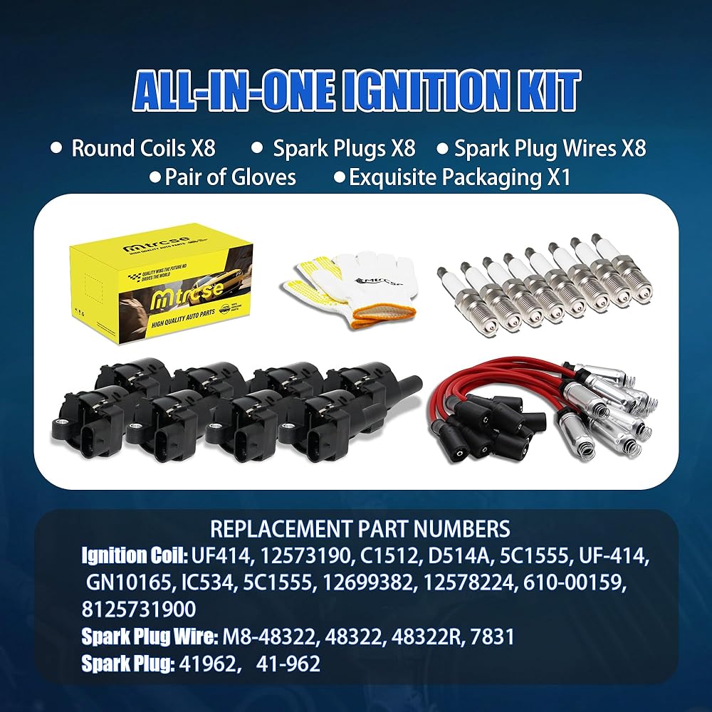 ✨【Package Includes】Each spark plug and coil pack kit includes 8 round UF414 ignition coils, 8 spark plugs wires (with clamps), 8 spark plugs, and pair of gloves. No extra parts needed. Everything works seamlessly together, saving you time and money on installation.