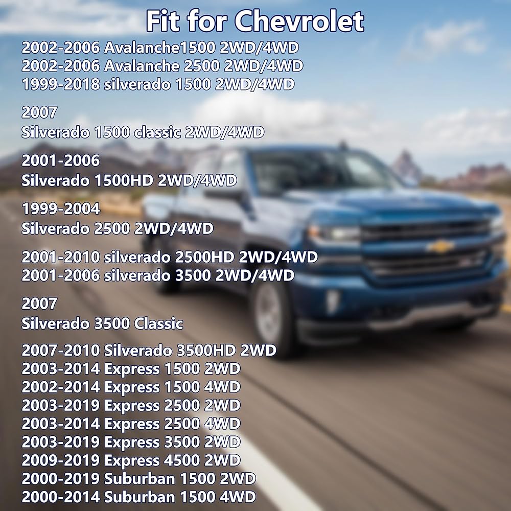 Fits Multiple GM Vehicles:Compatible with Chevrolet Avalanche1500 2WD/4WD 2002-2006;Avalanche 2500 2WD/4WD 2002-2006;Silverado 1500 2WD/4WD 1999-2018;Silverado 1500 Classic 2WD/4WD 2007;Silverado 1500HD 2WD/4WD 2001-2006;Silverado 2500 2WD/4WD 1999-2004;Silverado 2500HD 2WD/4WD 2001-2010 and more.