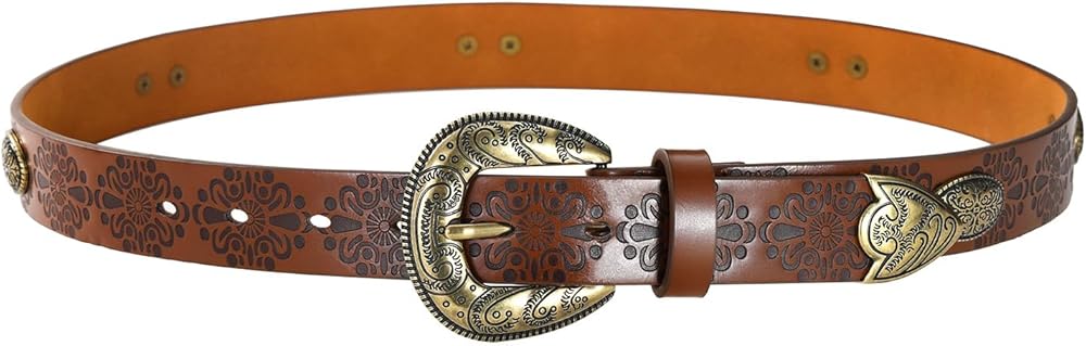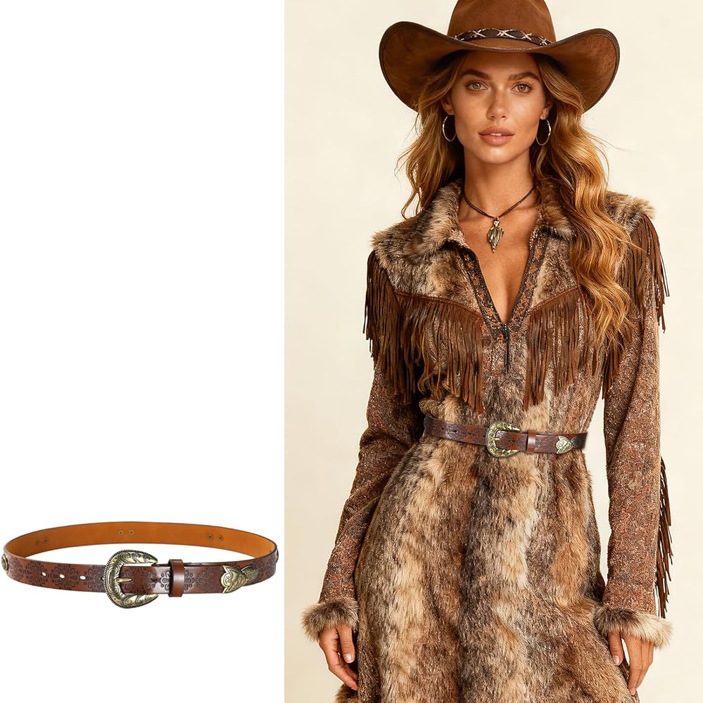 IDUNNVERVE western cowgirl belts for women are designed for daily jeans, western outfits, and classic country style. This brown leather belt uses smooth faux leather, firm stitching, and a vintage cowboy buckle to deliver a secure, flattering waistline. As a womens western belt, it fits jeans, pants, and casual tops, working as a brown belt women choose for ranch looks, rodeo events, travel, or weekend wear. The strap supports repeated use as a cowboy belt, cowgirl belt, or womens belt for jeans with flexible sizing for comfort. Ideal for women seeking western belts for woman styles that match denim jackets, flannels, boots, tees, and everyday fashion. This belt blends vintage belt details with modern durability, offering a versatile accessory for country belts for women, womens brown leather belt looks, and timeless western fashion. A practical pick for teens, professionals, and cowgirl-inspired wardrobes looking for a reliable waist belt for women with classic brown tones and a stylish buckle
