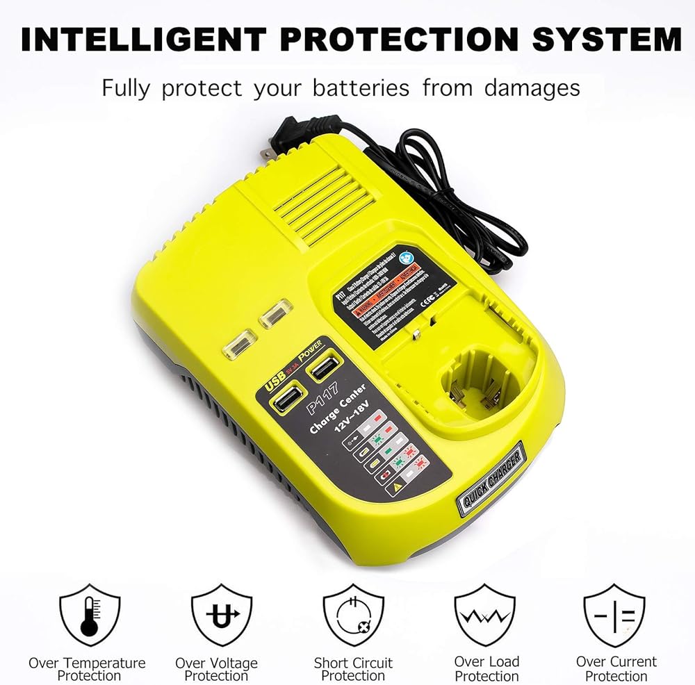 【Dual Chemistry Charger】The Ryobi charger can charge all Ryobi 12V 14.4V 18V MAX One+ Plus Ni-Cad, Ni-Mh & Lithium-Ion batteries, such as P100 P101 P102 P103 P104 P105 P106 P107 P108 P109 P122 P161(Not work with 14.4V and 12V Lithium-Ion Battery)