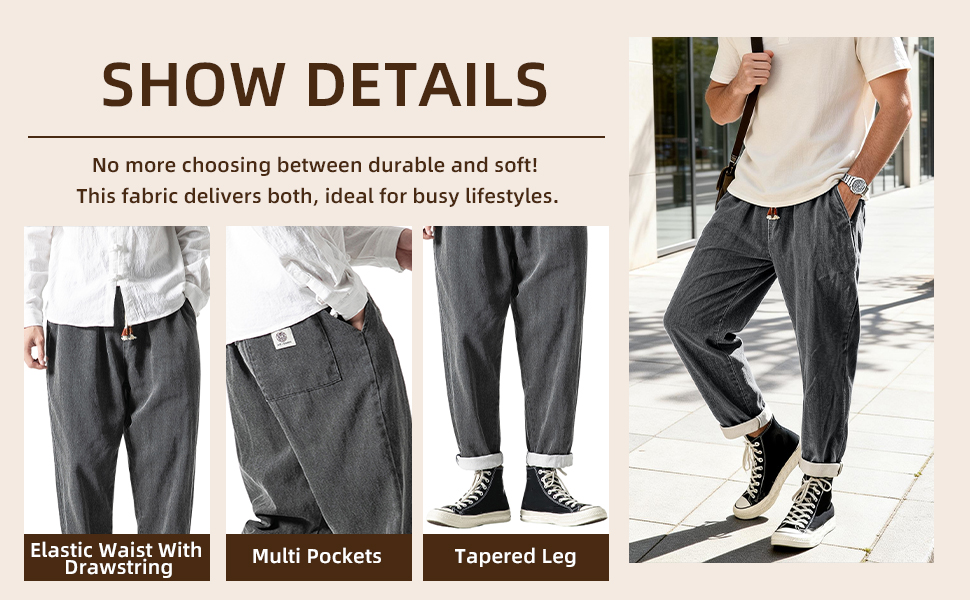 Design: Elastic waist, drawstring closure, tapered leg, regular fit, solid color, 2 slant pockets and 1 back pocket. These jean joggers have 9 colors for you choosing, blue,light blue, dark blue, black, khaki, grey, green, brown, blue grey.