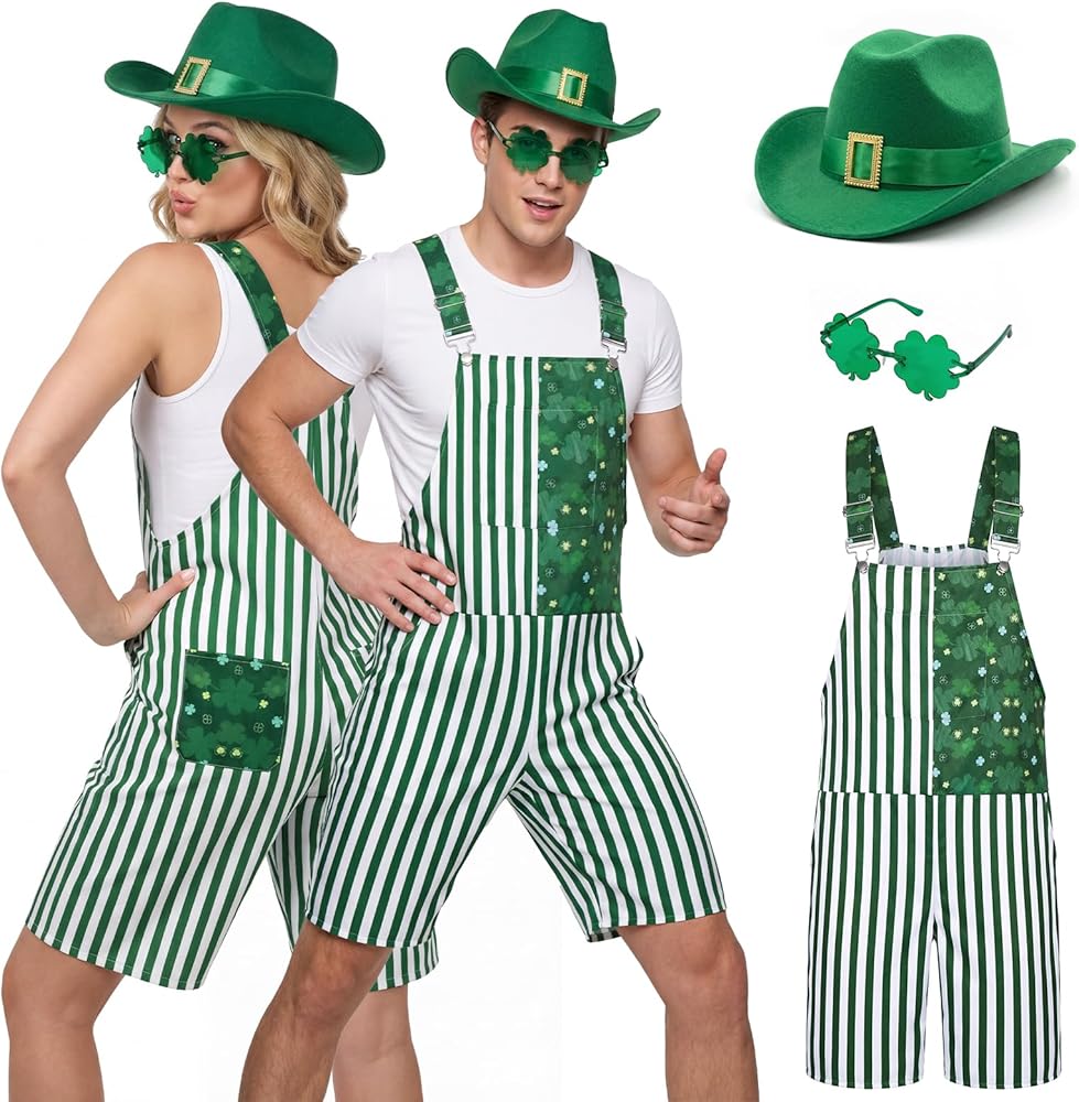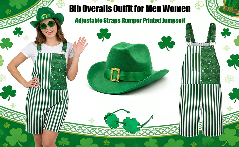 FESTIVE ST PATRICK'S DAY COMPLETE OUTFIT: Includes green-white striped shamrock overalls, matching hat and shamrock glasses. All-in-one Irish costume set for men and women, perfect for parade, pub crawl, holiday party and "wear green" events.