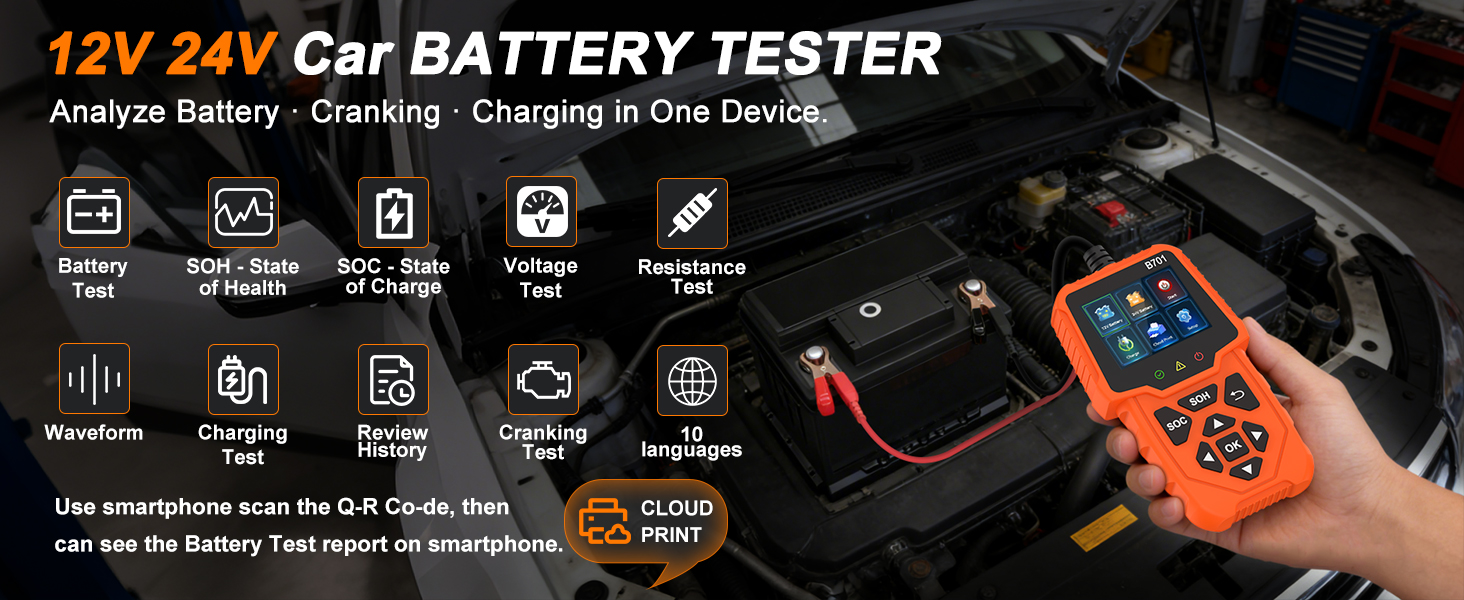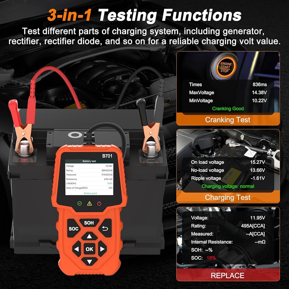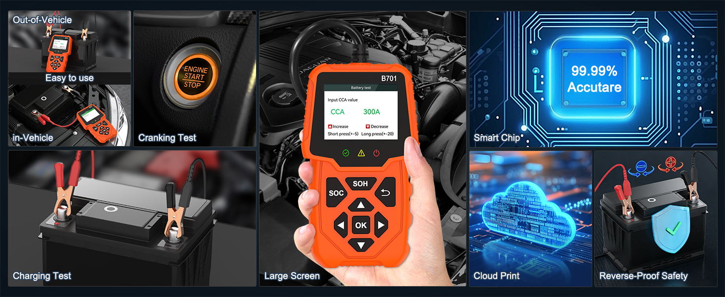 【Comprehensive Battery Diagnostics】The B701 battery analyzer utilizes advanced conductance technology to accurately measure the State of Health (SOH), State of Charge (SOC), voltage, internal resistance, and CCA of 12V/24V batteries. As a professional-grade 12V/24V car battery tester, it is fully compatible with conventional flooded, AGM, EFB, and GEL batteries within the 100-2000 CCA range, ensuring optimal performance evaluation for all battery types.