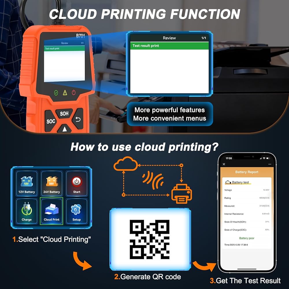 【Cloud Printing & Result Sharing】This battery load tester supports QR code-enabled cloud printing, effectively streamlining test record management. No additional application installation is required—simply select "Cloud Print" and scan the QR code to instantly view the complete test report in your mobile browser. Users can directly output reports via any printer or share them with clients and social platforms with just one click. The specially designed pre‑formatted label paper allows for quick printing of standardized test results, significantly enhancing customer information management efficiency. It serves as an ideal collaboration tool for professional technicians and service providers.