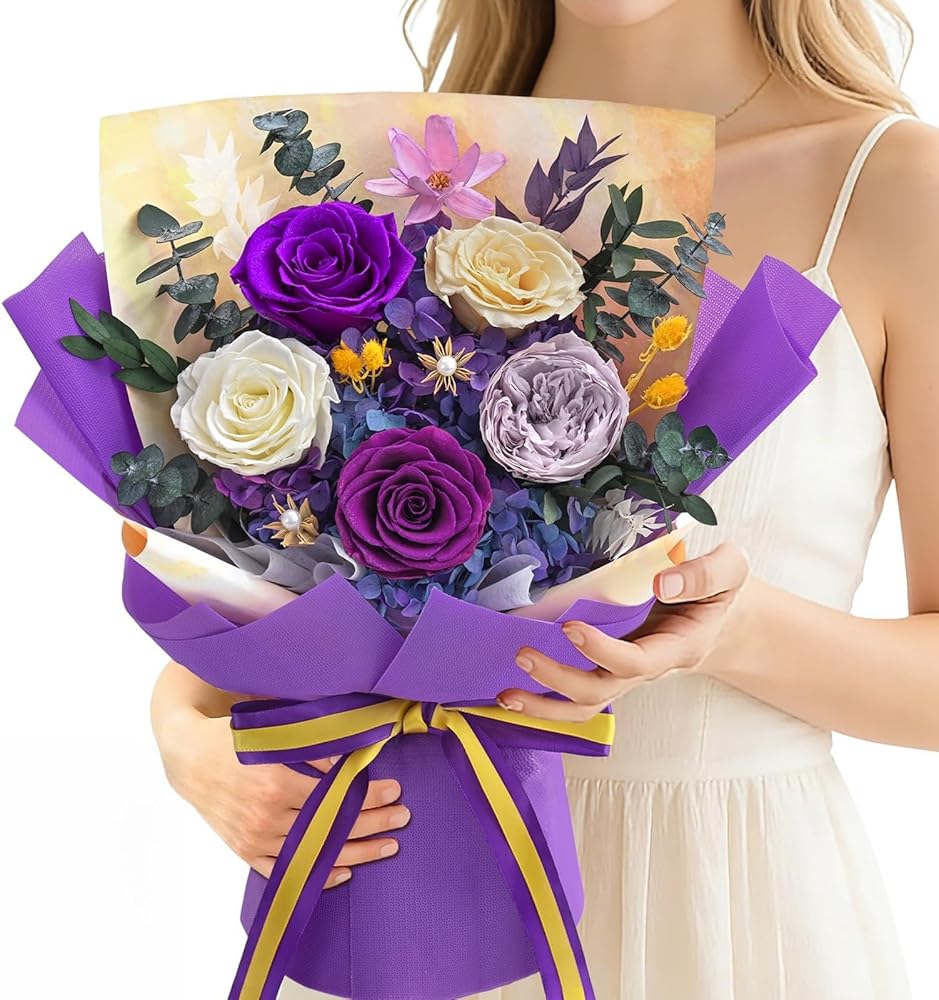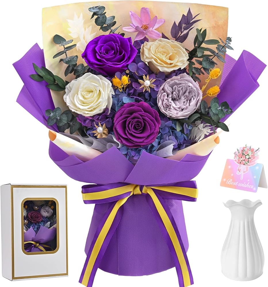 Premium Ready-to-Gift Set: Each forever roses bouquet arrives in a luxurious gift box with a vase, brand card, and greeting card. Simply unbox for an instant elegant display—no wrapping needed.