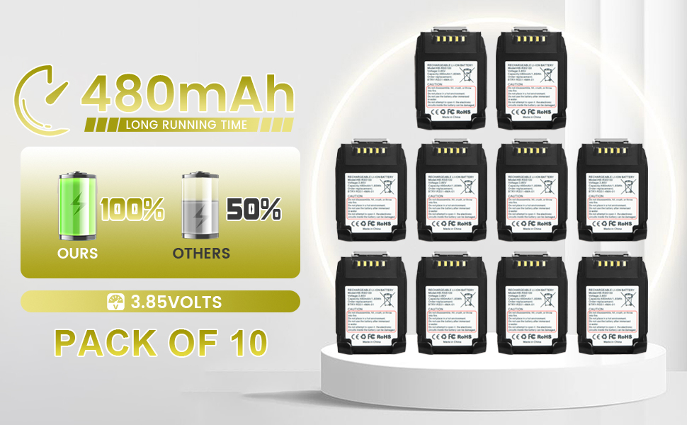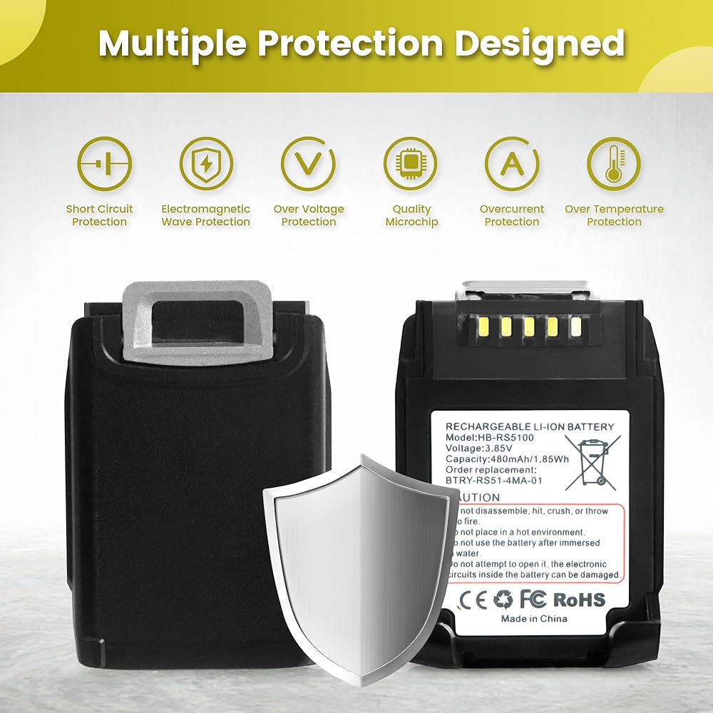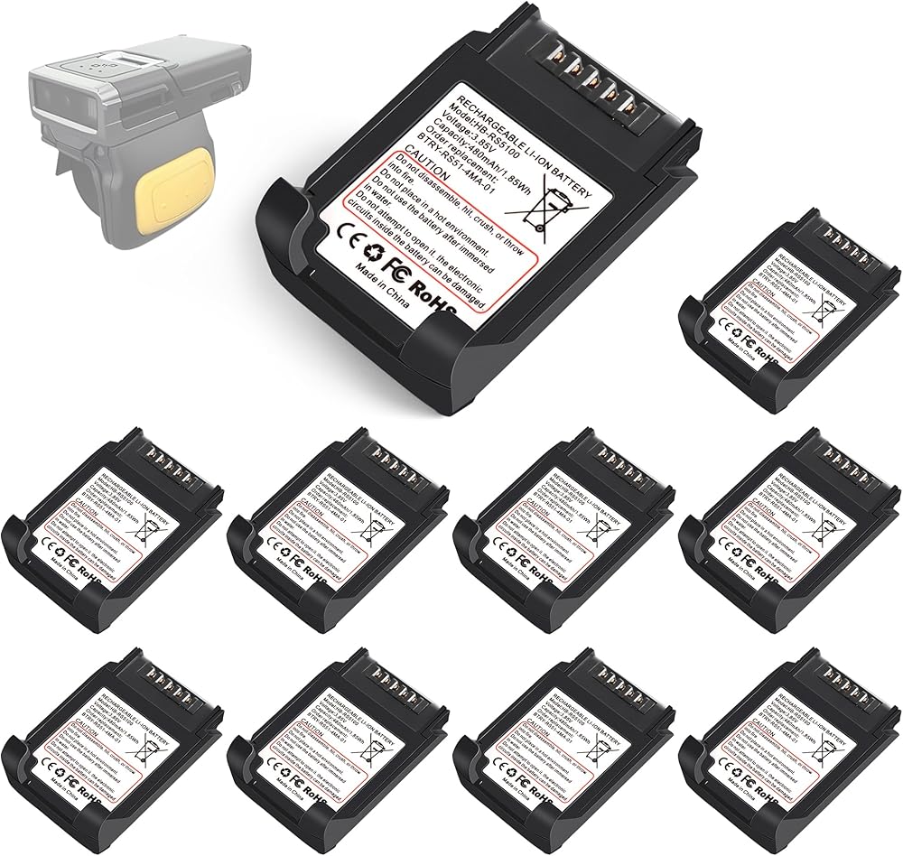 RS51 battery ring scanner replacement: This 10-pack bundle of replacement batteries ensures for Zebra RS5100 ring scanners never stop scanning. Designed for high-volume environments like warehouses, distribution centers, and retail stockrooms. Built in 480mAh capaticy and 3.85 Volts