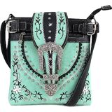 Rhinestone silver buckle with western embroidered floral cut design on carved leather patterns.