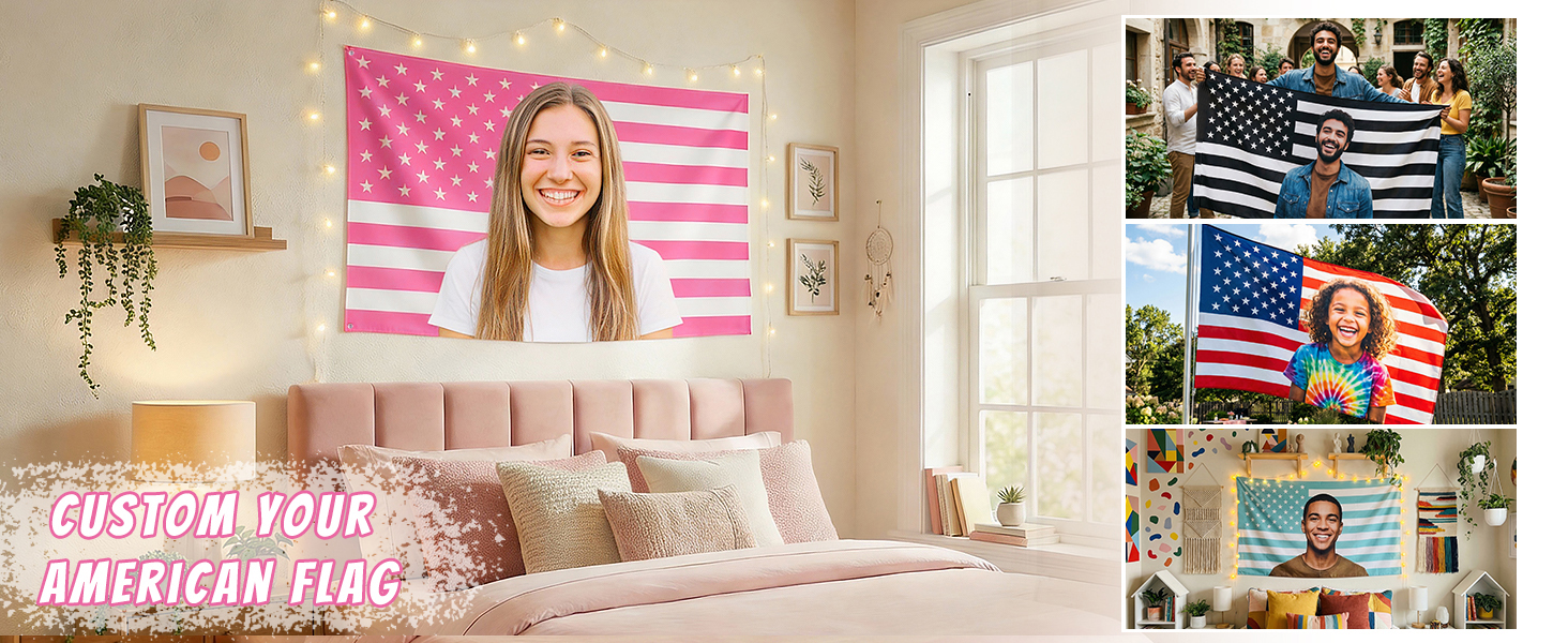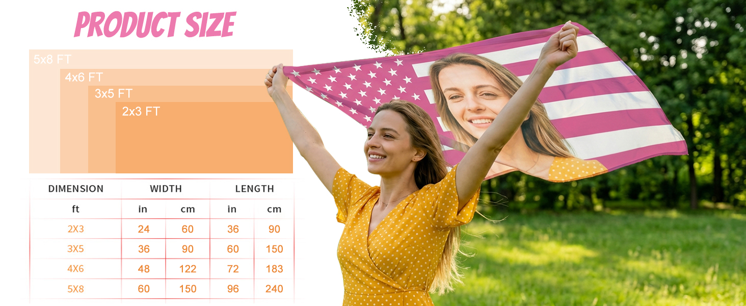 【Custom Flag for Effortless 3-Step】:Create your unique custom pink American flag in just three simple steps.The first step is to Click “Customize Now” to select the custom flag color and size.The second step is upload your photos ( family, couples, friends, celebrities, idols, actors,actress,or pets). and The third step is enter text with your preferred font.we'll professionally remove the background, leaving only the portrait you want highlighted on this premium custom flag
