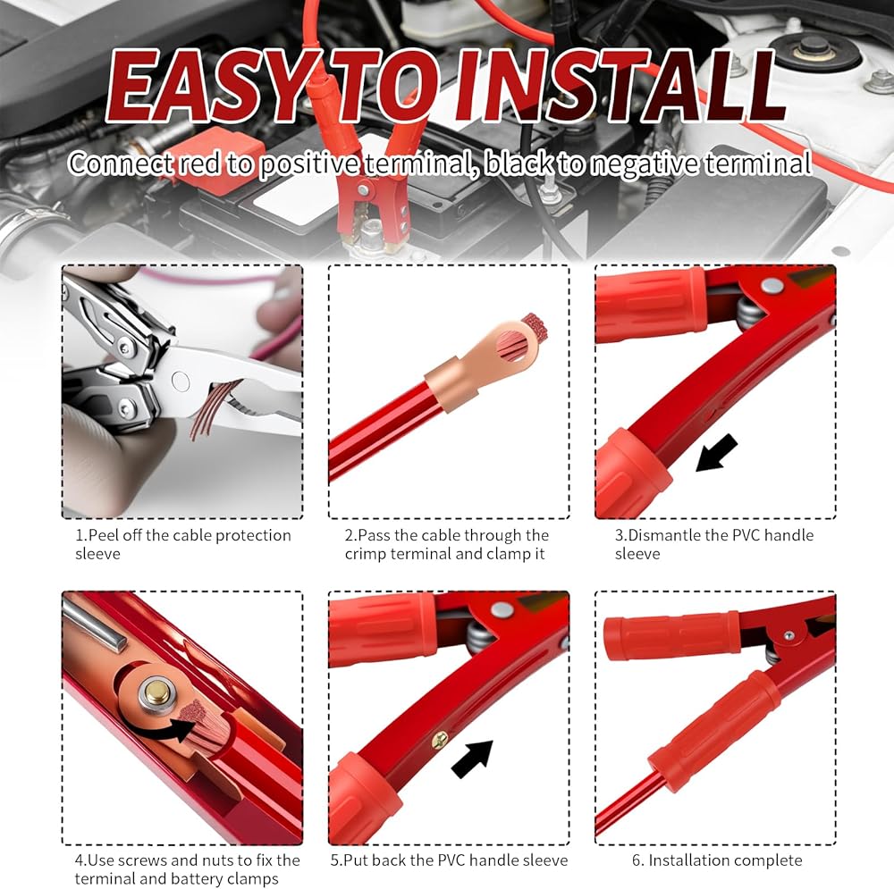 • Easy to Install: Strip the cable sheath, thread the cable into crimp terminal and clamp it, dismantle the handle sleeve, secure the cable and crimp terminal to alligator clamps with screws and nuts, reinstall PVC handle sleeve, connect red to positive terminal, black to negative terminal
