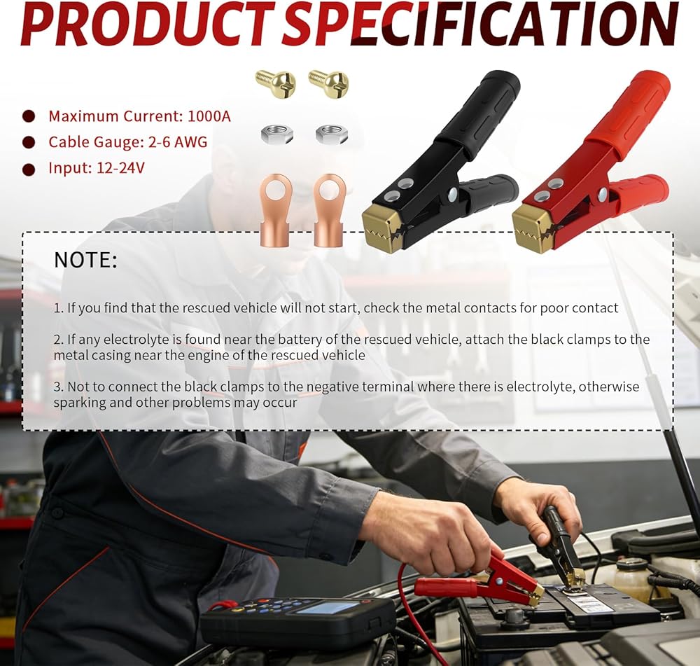 • Product Specification: You will receive 2pcs jumper cable clamps, instantaneous current 1000A, working current 500A, compatible with cable gauge 2-6 AWG, 2pcs crimp terminals, 2pcs screws and 2pcs nuts, a full kit of accessories, to meet your repair needs, no need to buy additional accessories