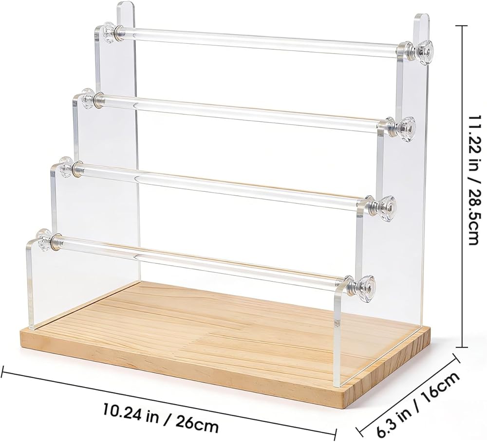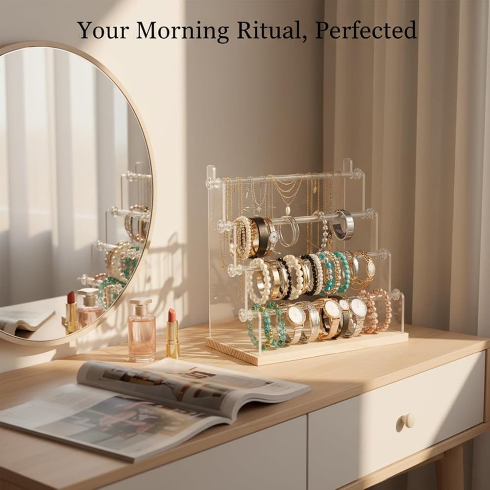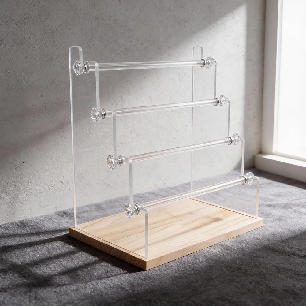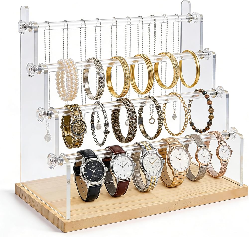 4-Tier Bracelet Holder Stand with Wood Base, Acrylic Jewelry Organizer & Display for Necklaces, Bangles, Watches, Multi-Functional Jewelry Storage for Home and Store Display