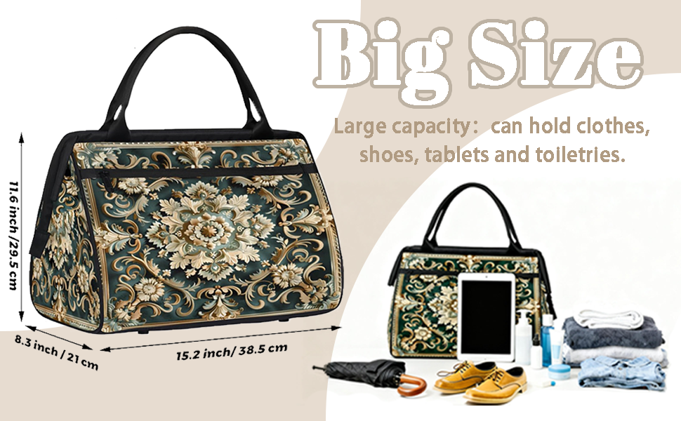 【Large Capacity】This small overnight weekender tote bag measures 15.2 × 8.3 × 11.6 inches, providing ample space to carry all your essentials for a short trip. The spacious main compartment easily fits clothes, shoes, toiletries, and water bottles, keeping your items organized while traveling. Its wide-opening design makes packing and unpacking quick and hassle-free. Whether you're heading for a weekend getaway, hitting the gym, or just on the go, this stylish tote has you covered.