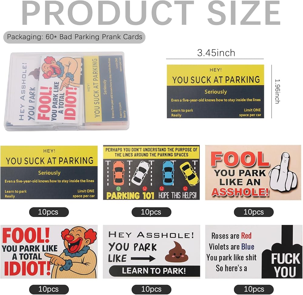 6 Designs: The Bad Parking Cards set includes 6 distinct humorous designs, with 10 cards per design totaling 60 cards. The backs feature phrases like "LEARN TO PARK", "YOU SUCK AT PARKING", and "FOOL! YOU PARK LIKE A TOTAL IDIOT!" allowing you to precisely match the message to the absurdity of the vehicle's parking
