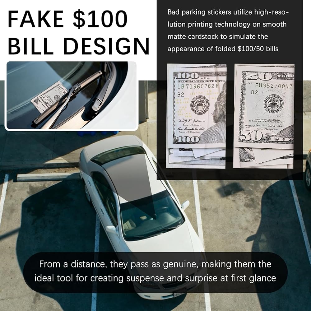 Fake $100 Bill Design: Bad parking stickers utilize high-resolution printing technology on smooth matte cardstock to simulate the appearance of folded $100/50 bills. From a distance, they pass as genuine, making them the ideal tool for creating suspense and surprise at first glance