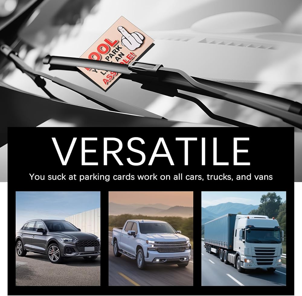 Versatile: You suck at parking cards work on all cars, trucks, and vans. The instructions are laughably simple: just pick a card, slip it under the windshield wiper or onto the window of your target vehicle, then walk away with a mischievous grin