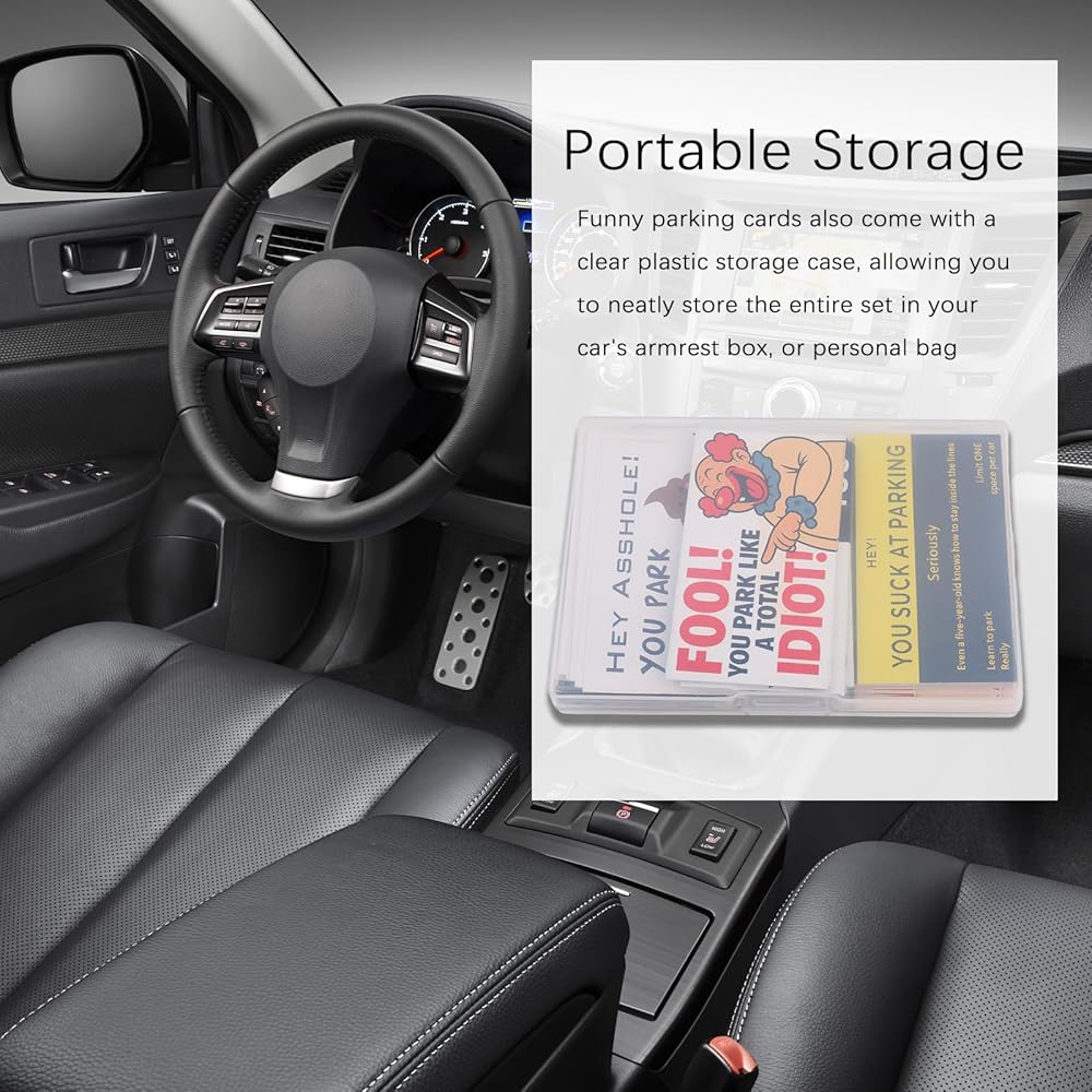 Portable Storage: Measuring 3.45 x 1.96 inches, it's a convenient size. funny parking cards also come with a clear plastic storage case, allowing you to neatly store the entire set in your car's armrest box, or personal bag. This way, you can grab them anytime you spot a "target"