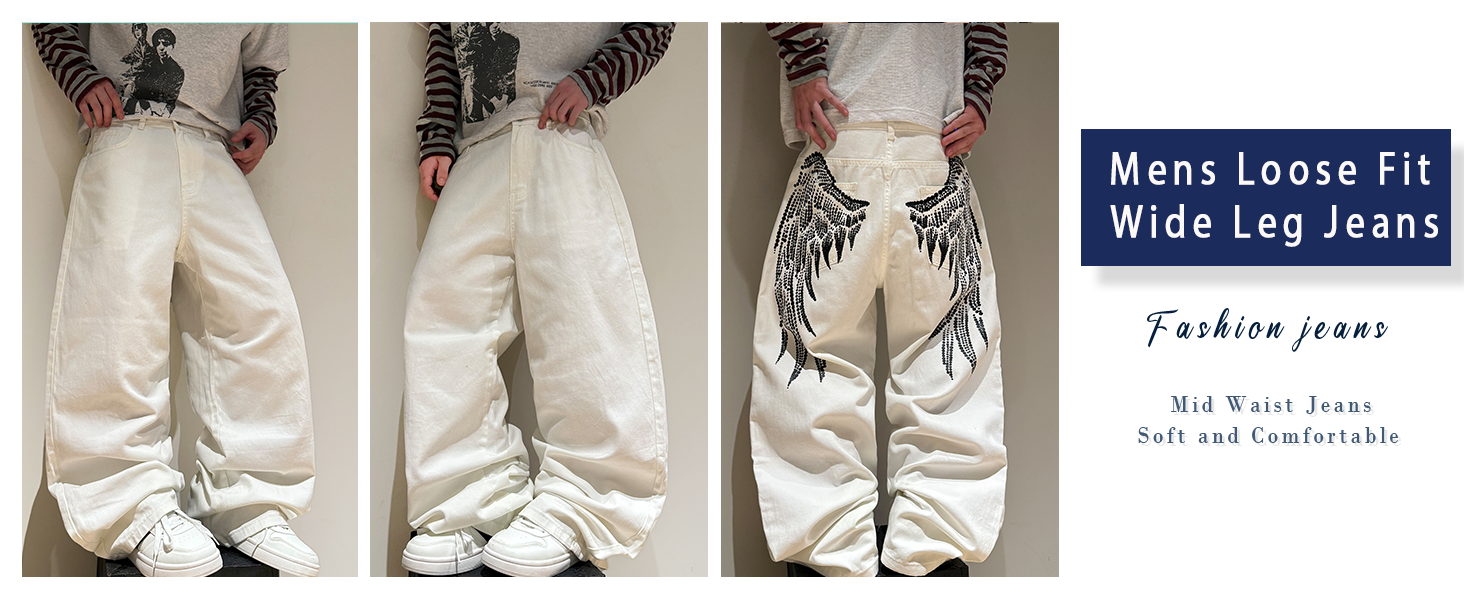【Matching Tips】Baggy Jeans are easy to match with a simple t-shirt or casual button-down shirt for a laid-back look. Layer with a jacket or hoodie in cooler weather. The unique back wing pattern design adds interest, so keep the rest of your outfit understated to let the jeans shine. Complete with sneakers, boots, or casual shoes for a balanced style.