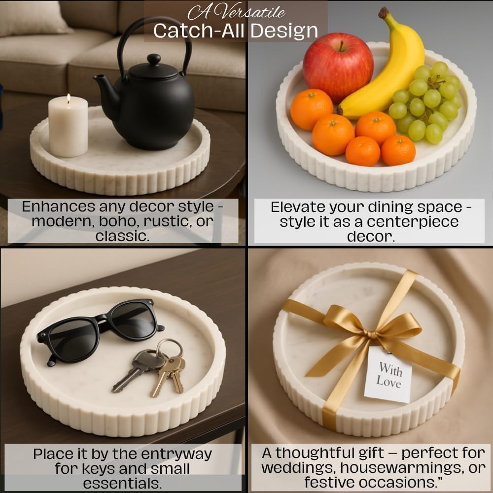 ALL-IN-ONE DECORATIVE TRAY- Our fluted circle tray can serve multiple purposes, such as keeping keys, holding fruits, acting as a catch all tray or you can place some small articles on it, such as tea light, plant, salt and pepper and so on. You can also use it as a candle tray, tea tray, centerpiece tray or round serving tray for dry items.