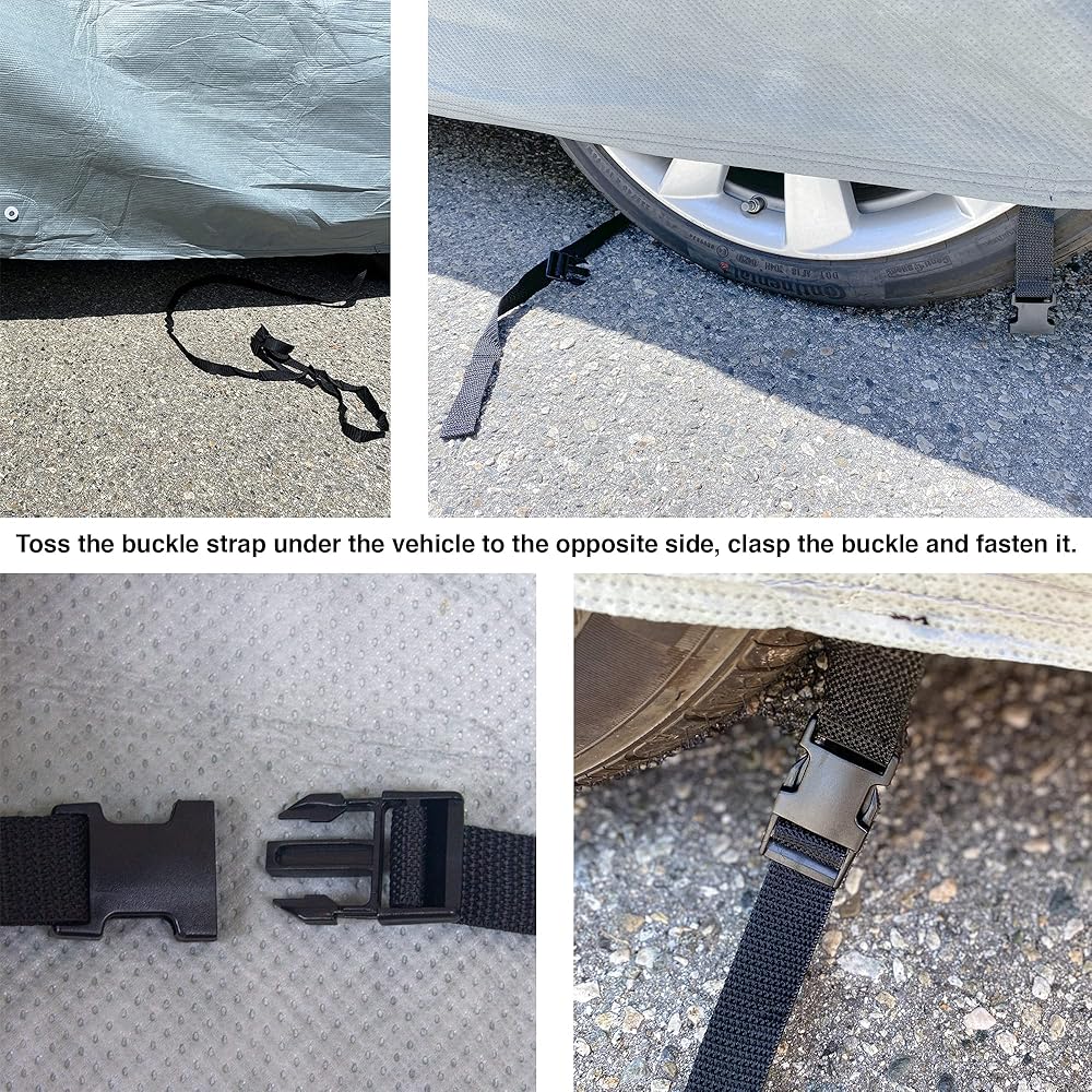 SECURE TIE-DOWN SYSTEM Our car covers come equipped with a stretchy elastic hem along the bottom edge for a snug, custom-like fit. Reinforced grommet holes allow for secure tie-down with ropes or locks without the worry of scratching your vehicle's surface. These covers are designed for easy cleaning, providing year-round indoor and outdoor protection.