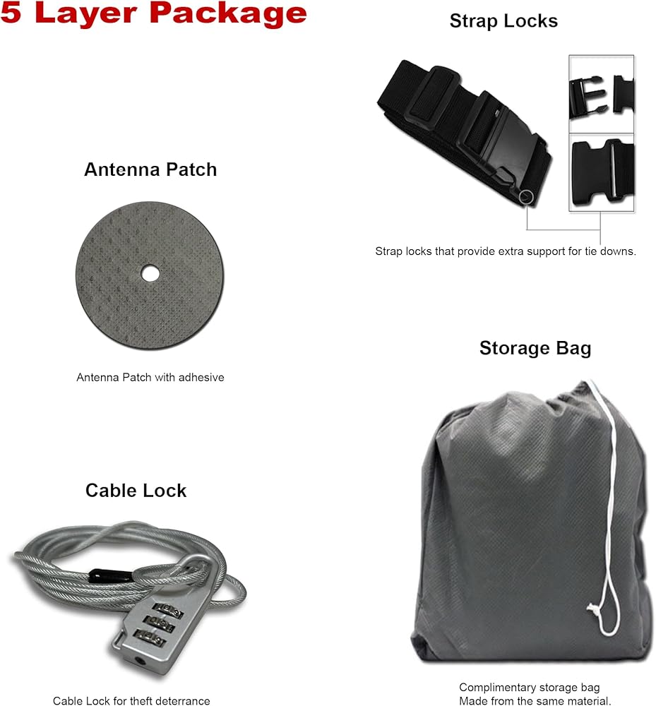 COMPLETE COVERAGE ACCESSORIES Each purchase comes with essential accessories for added convenience and security. This includes an antenna reinforcement patch with adhesive, buckle strap locks for a firm hold, a cable and lock for enhanced security, and a durable storage bag made from the same tough material as the car cover. The storage bag is spacious enough to store the cover and any additional equipment, ensuring both durability and convenience.