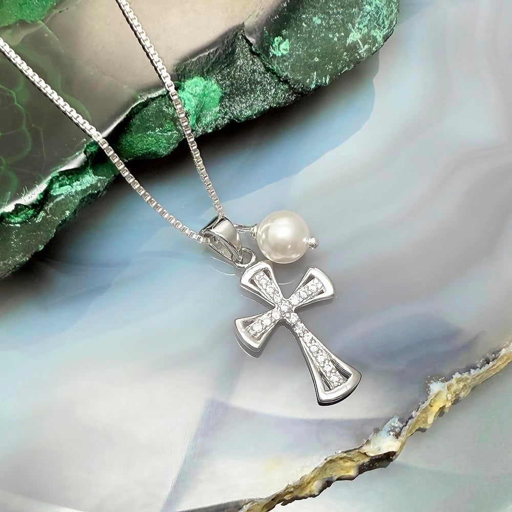 Sterling silver cross, encrusted with shimmering cubic zirconia crystals and adorned with a lustrous white crystal pearl - this necklace makes a perfect gift for any young girl on her First Communion and a beautiful symbol of faith that will guide and inspire her on her spiritual journey. Crafted with excellent quality sterling silver, this cross radiates elegance and grace.