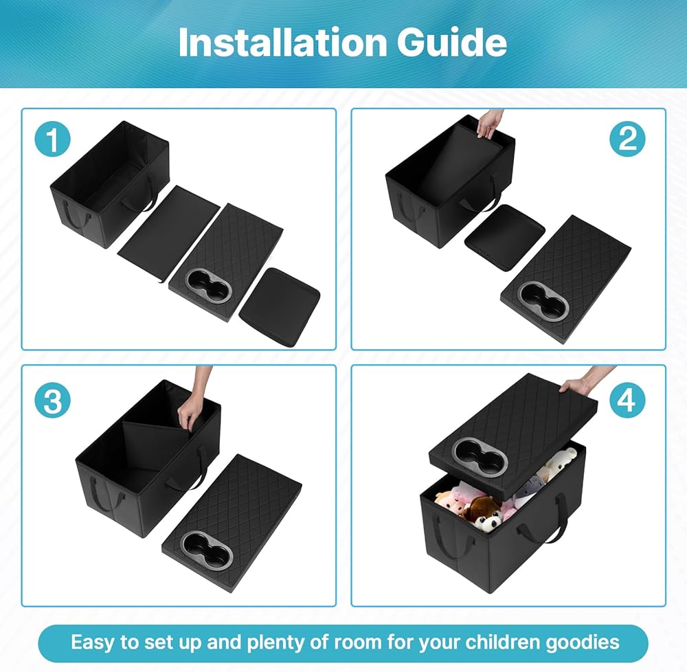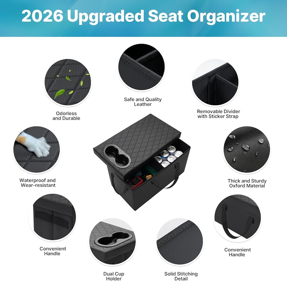 Generous Storage Capacity: This backseat car organizer for Ford Explorer keeps your vehicle tidy and clutter-free. Designed with four-sided secure handles and convenient cup holders. The organizer features removable dividers with adhesive labels, allowing you to customize compartments to fit various items and keep them neatly separated. As a 2nd row console accessory, it fits Ford Explorer perfectly.