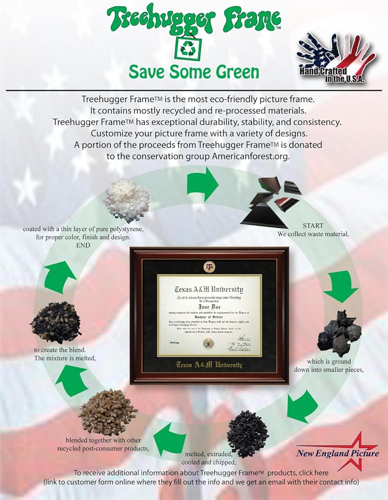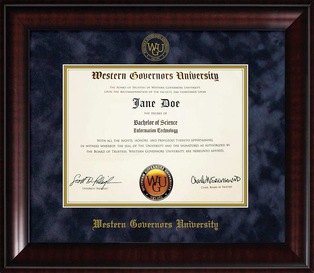 Manufactured by New England Picture, our Western Governors diploma frame is custom made and handcrafted in the USA by an expert group of picture framers. This classic frame is finished with premium clear plexiglass with UV filtering properties. Mahogany furniture finish eco-friendly TreehuggerTM frame with navy blue suede mat. A gold embossed WGU Seal is above the diploma opening and "Western Governors University" Olde English lettering is gold embossed below the diploma opening. Please verify that your diploma size is 11x8.5” Overall frame size is about 18x16". Acid free tape and easy diploma framing instructions are included.