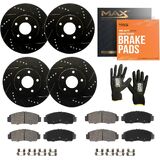 Complete Replacement Brake Kit: Includes 2x front + 2 rear e-coated slotted & drilled brake rotors, 8 low-dust ceramic brake pads, installation hardware, anti-seize lubricant, and work gloves for straightforward installation.
