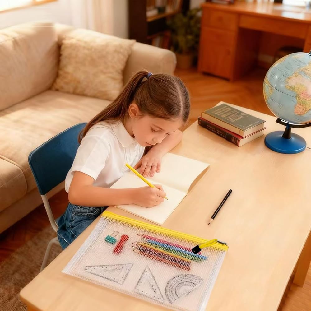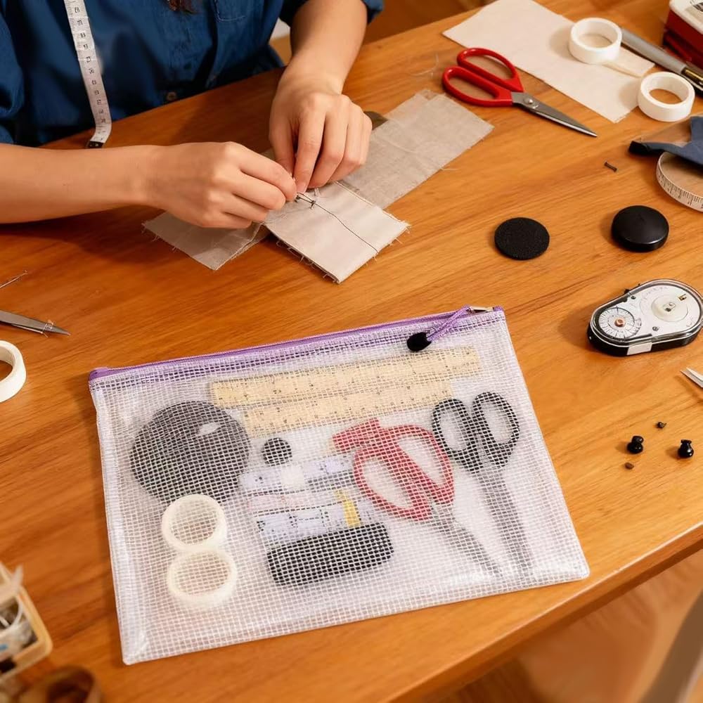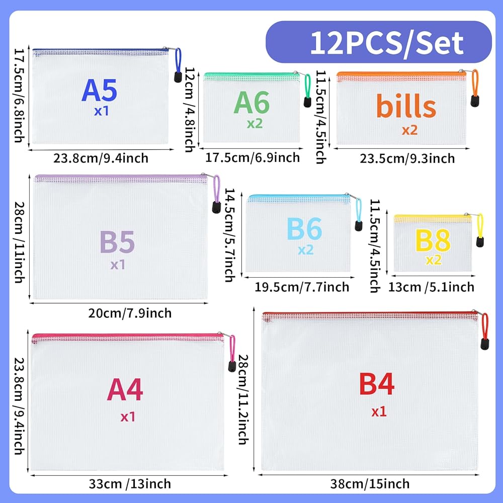 This 12-piece zipper pouch kit brings order to everyday chaos. You get eight colors and eight sizes — from roomy B4 and A4 mesh zipper pouch bags for documents and puzzles to smaller B6, A6, B8 and bill-sized pouches for receipts, cards, cables, and tiny craft pieces. The semi-transparent PVC mesh makes it easy to spot what you need without digging, while the sturdy, water-resistant construction protects contents from spills and everyday wear. Smooth, reliable zippers keep everything secure and make grabbing what you need quick and simple. Use the larger zippered pouches for travel documents, school handouts, or makeup, and the smaller zipper pouches for coins. Teachers will love how fast classroom supplies get sorted; travelers will enjoy grabbing a single pouch for toiletries. These reusable zipper pouches are easy to clean, and flexible enough to live in backpacks, purses, and carry-ons. Whether you're organizing a classroom, streamlining your office, or packing for a weekend trip, this set of mesh zipper pouch bags offers color-coded, durable, and practical storage that actually gets used — not forgotten in a drawer.