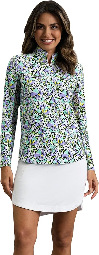 The Sonia Print Long Sleeve Mock Neck Top blooms with bold hibiscus-inspired florals for a playful tropical vibe. Made with our signature Iceƒil fabric, it's soft, light, and breathable—keeping you up to five degrees cooler while wicking away moisture and resisting odor. Underarm mesh panels add airflow, and UPF 50+ sun protection makes it a must-have for sunny escapes and everyday adventures.