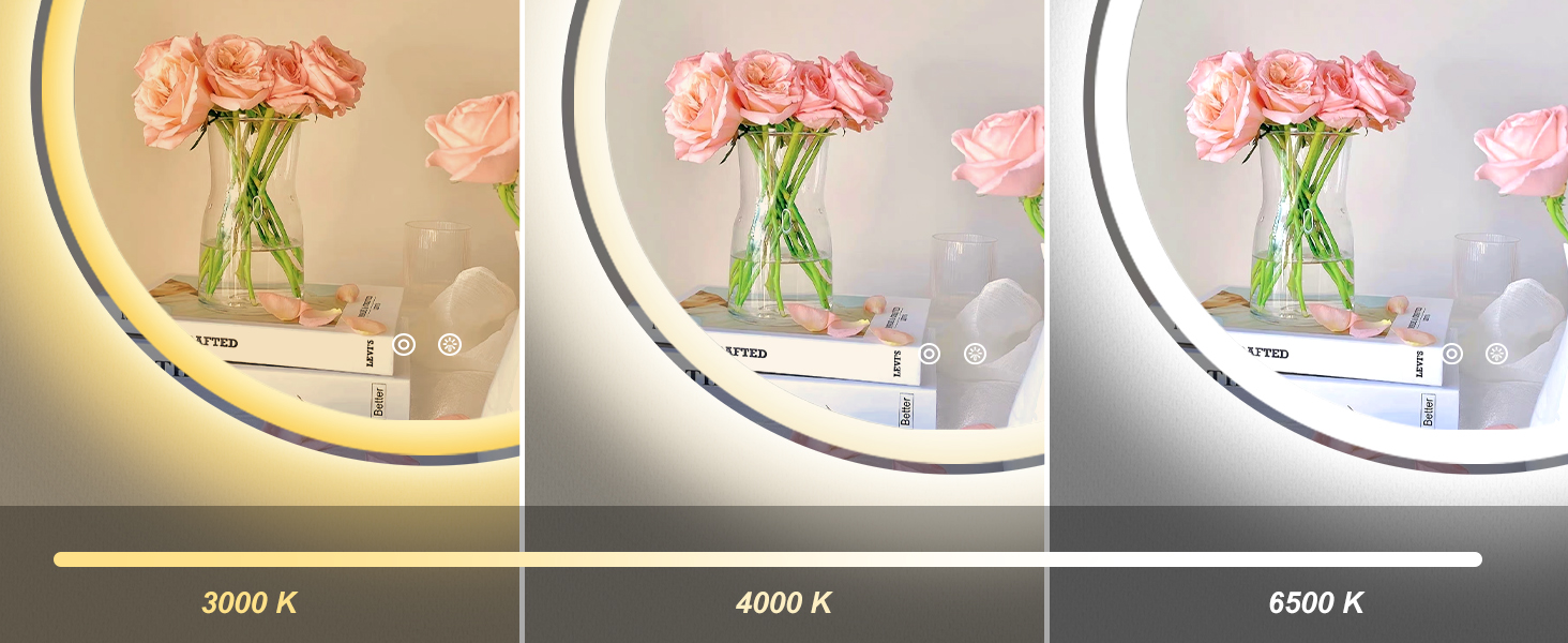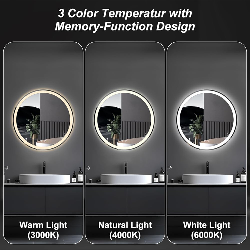 [Dimmable & 3 Color Temperature] Enjoy full control over your bathroom ambiance: simply long-press to adjust brightness and short-press to switch between warm (3000K), natural (4000K), and white (6000K) light. Lighted bathroom mirror perfect for creating the ideal mood for any routine.