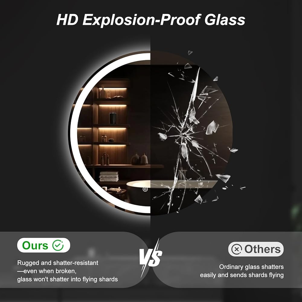 [Shatter-Proof HD Glass]Bathroom vanity mirror is crafted from 5mm tempered glass, this mirror is explosion-resistant, durable, and distortion-free, providing a crystal-clear reflection while ensuring peace of mind for your household.