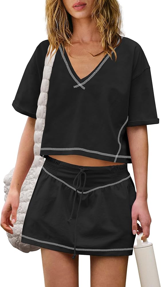 Feature: Stay stylish and comfortable with the workout sets for women! The relaxed short-sleeve v-neck tee features dropped shoulders, defined seaming, and a cropped silhouette, while the high-rise mini skort includes built-in shorts, a drawstring waistband, and side pockets. Perfect for workouts or casual wear, the matching sets women clothing can be paired together or styled separately for endless outfit options. Effortlessly elevate your wardrobe with this chic and functional duo!