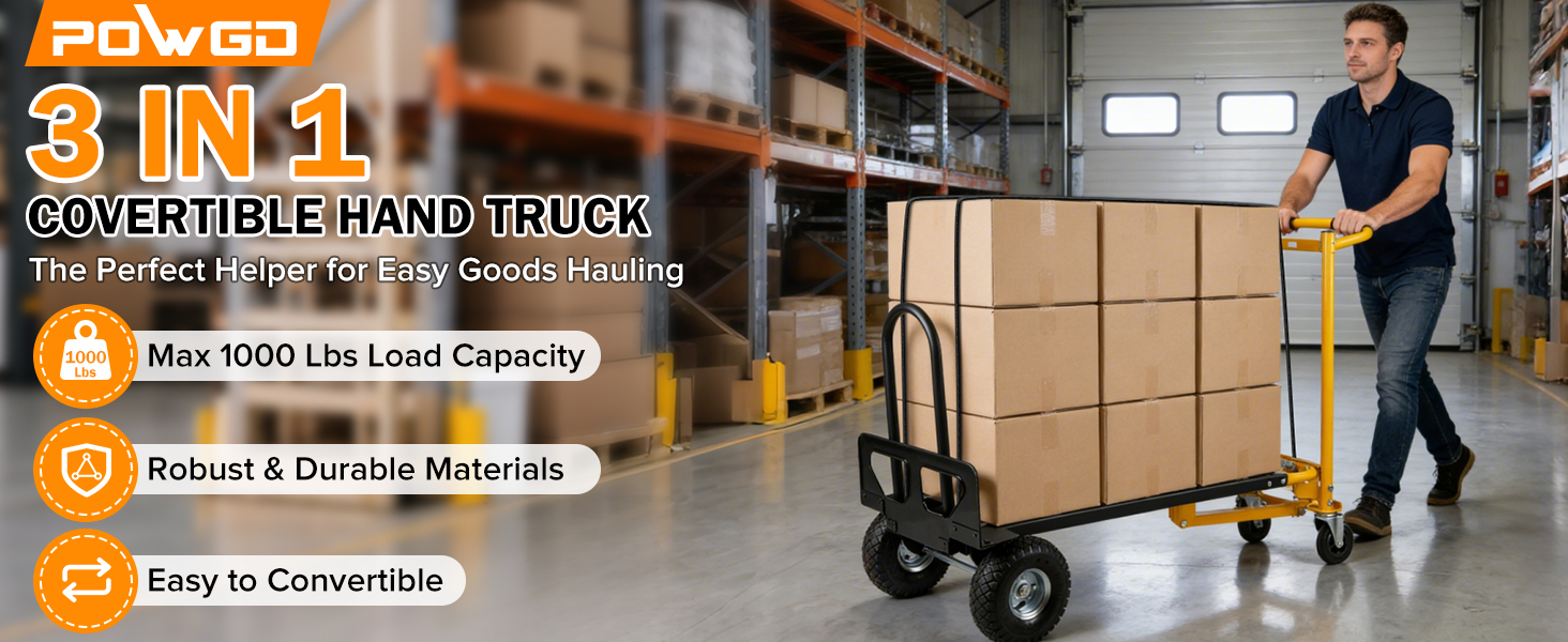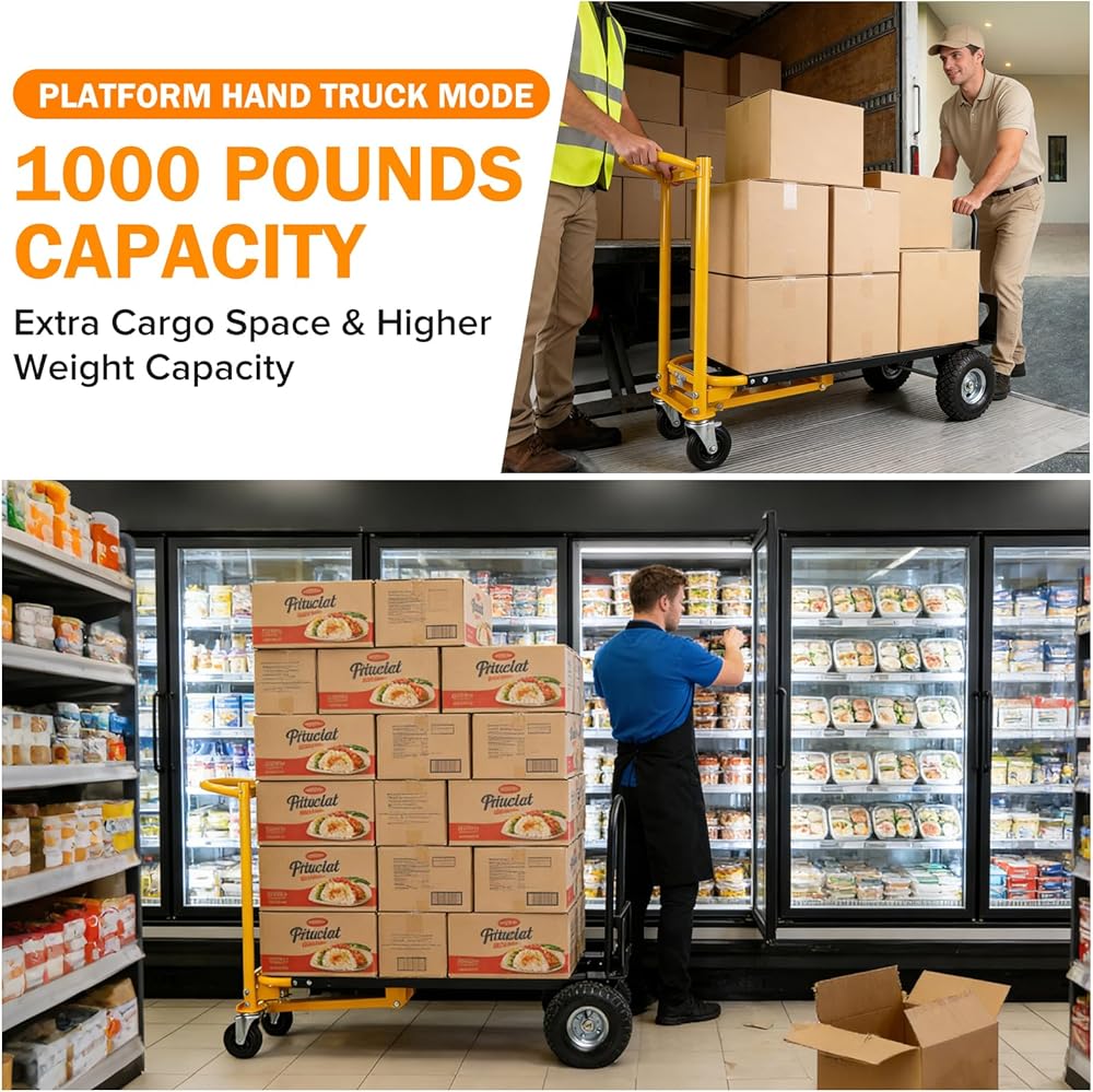 3 in 1 Convertible Hand Truck Dolly Cart with 10" Pneumatic Tire,1000LBS Capacity Hand Trucks Heavy Duty,Hand Cart with Bungee Cords for Logistics, Shopping, Home, Office Moving(Black Yellow)