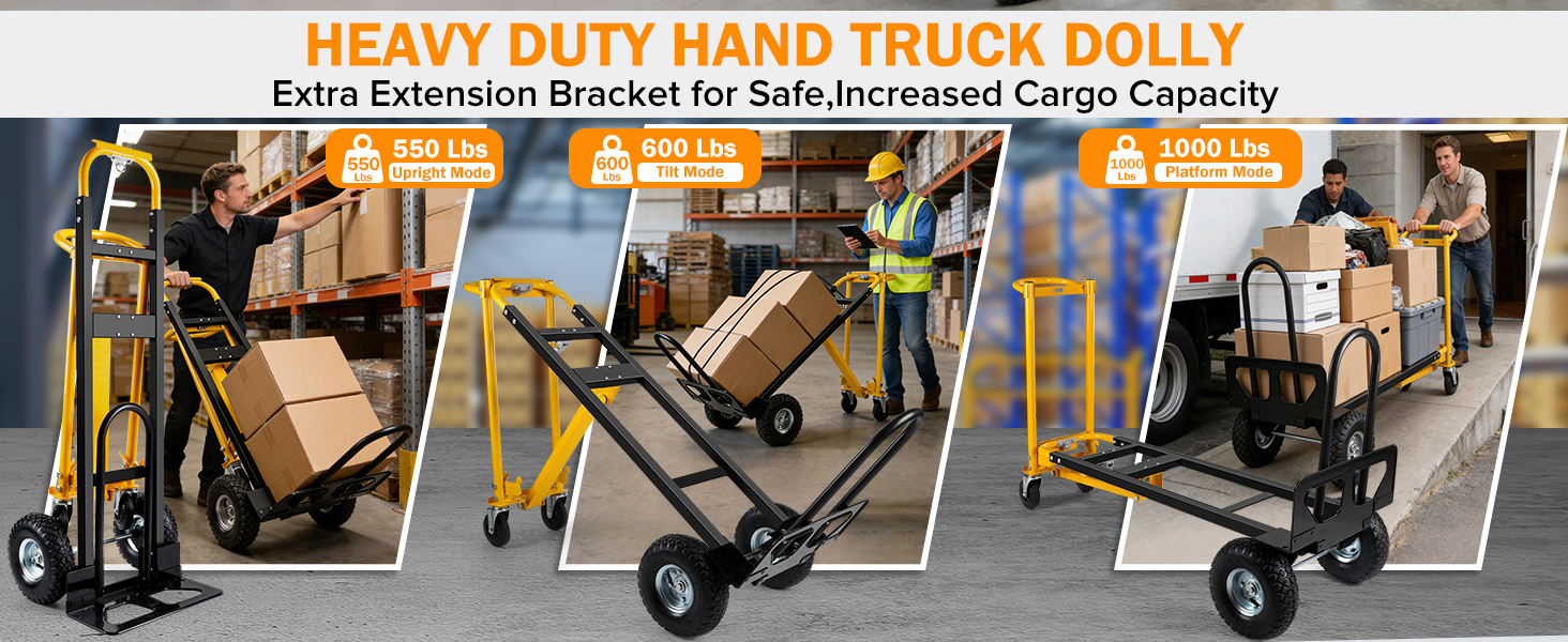 【1000LBS SUPER LOAD CAPACITY】Our dolly hand truck is made of reinforced carbon steel frame, with a lightweight design and rust resistant durability, making it easy to meet daily heavy load needs.The maximum load of the four-wheel platform mode is up to 1000 pounds, the tilt cart mode is 600 pounds, and the upright mode is 550 pounds. It is equipped with a retractable anti drop bracket to firmly fix the load during movement, making transportation safer and more worry free